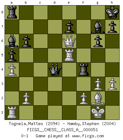 Last move : 0-1 2010 January 11 20:43:38 [Event "FICGS__CHESS__CLASS_A__000051"] [Site "FICGS"] [Date "2009.05.21"] [Round "1"] [White "Tognela,Matteo"] [Black "Hamby,Stephen"] [Result "0-1"] [WhiteElo "2094"] [BlackElo "2004"] 1.Nf3 d5 2.g3 Nf6 3.Bg2 c6 4.c4 dxc4 5.O-O Nbd7 6.Qc2 Nb6 7.a4 a5 8.Na3 g6 9.Nxc4 Nxc4 10.Qxc4 Bg7 11.e4 O-O 12.h3 b6 13.Re1 Ba6 14.Qb3 Nd7 15.d4 c5 16.e5 cxd4 17.Nxd4 Nxe5 18.Ne6 fxe6 19.Rxe5 Qd4 20.Qxe6+ Kh8 21.Bf4 Rxf4 0-1 This chess game has been lost on time (started : 2009.05.21 14:16:37) Reti : King's Indian attack (Barcza system) Kingside Castling by player White (move 5) Kingside Castling by player Black (move 11) Player Black won this chess game. Follow this game move after move (download)If your opponent offers you a draw, try to work out why he thinks he's worse off. (Nigel Short) Als er Schachweltmeister wurde ließ er praktisch alle stärksten Sovietspieler für sich arbeiten. Wenn ein auch nur mittelmässiger Meister ein Spezialist für eine bestimmte Eröffnung war, wurde er von Karpov gerufen. Das wurde alles geheim gehalten. (Mikhail Moiseyevich Botvinik) Cuando me preguntan: -¿Cual es el secreto que te hace hacer mejores movidas que tus oponentes?, Yo respondo: Me da gusto que me pregunten eso, porque, como veran, hay una simple razón. Yo pienso mis propias movidas y dejo a mi oponente que el piense las suyas. (Alexander Alekhine) La menace est plus forte que l'exécution. (Aaron Nimzovitch) There is a computer disease that anybody who works with computers knows about. It's a very serious disease and it interferes completely with the work. The trouble with computers is that you 'play' with them ! (Richard P. Feynman)