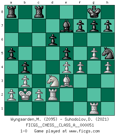 Last move : 1-0 2009 November 19 8:28:7 [Event "FICGS__CHESS__CLASS_A__000051"] [Site "FICGS"] [Date "2009.05.21"] [Round "1"] [White "Wyngaarden,Martin"] [Black "Suhodolov,Dmitry"] [Result "1-0"] [WhiteElo "2095"] [BlackElo "2021"] 1.e4 c5 2.Nf3 d6 3.d4 cxd4 4.Nxd4 Nf6 5.Nc3 a6 6.f3 e5 7.Nb3 Be6 8.Be3 Nbd7 9.g4 Nb6 10.g5 Nh5 11.Qd2 Be7 12.O-O-O O-O 13.Rg1 Qc7 14.h4 Nc4 15.Bxc4 Bxc4 16.Kb1 a5 17.Nc1 b5 18.Nd5 Bxd5 19.Qxd5 Rfc8 20.Rd2 b4 21.Nd3 Qc4 22.Qxc4 Rxc4 23.b3 Rc3 24.Kb2 R3c8 25.f4 1-0 This chess game has been lost on time (started : 2009.05.21 14:16:37) Sicilian : Najdorf Queenside Castling by player White (move 12) Kingside Castling by player Black (move 12) Player White won this chess game. Follow this game move after move (download)The passed Pawn is a criminal, who should be kept under lock and key. Mild measures, such as police surveillance, are not sufficient. (Aaron Nimzovich) Die Idee von Capablanca, Schach als Fach in den Schulen zu lehren, ist großartig. (Fidel Castro) No soy una persona materialista y por eso, no resiento la falta o pérdida del dinero. La ausencia de cosas mundanas carece de importancia. Ya que el Ajedrez es una forma en la que puedo ser tan materialista como yo desee sin tener la necesidad de vender mi alma. (Jamie Walter Adams) A ce moment-là, je menaçais de comprendre la position ! (Clément L'Heureux) Programming can only do so much before it becomes too much. (Don Groves)