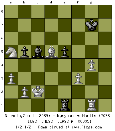 Last move : 1/2-1/2 2009 September 10 17:37:55 [Event "FICGS__CHESS__CLASS_A__000051"] [Site "FICGS"] [Date "2009.05.21"] [Round "1"] [White "Nichols,Scott"] [Black "Wyngaarden,Martin"] [Result "1/2-1/2"] [WhiteElo "2089"] [BlackElo "2095"] 1.e4 c5 2.Nf3 d6 3.d4 cxd4 4.Nxd4 Nf6 5.Nc3 a6 6.Be3 e5 7.Nb3 Be6 8.f3 h5 9.Nd5 Bxd5 10.exd5 Nbd7 11.Qd2 g6 12.O-O-O Nb6 13.Kb1 Nfxd5 14.Bf2 Nf6 15.Bh4 Be7 16.Bxf6 Bxf6 17.Qxd6 Qxd6 18.Rxd6 Bd8 19.Rd1 f5 20.Na5 Rb8 21.Rd6 Bc7 22.Rxg6 Kf7 23.Rg5 Nd5 24.Nb3 Ne3 25.Bd3 h4 26.Rxf5+ Nxf5 27.Bxf5 Rbd8 28.c4 b6 29.Be4 Rhg8 30.Rg1 Rg5 31.g4 hxg3 32.hxg3 Rh5 33.Rg2 Rh1+ 34.Kc2 R8d1 35.Bd5+ Kg7 36.Nd2 b5 37.Re2 Ba5 38.Nb3 Rde1 39.Rg2 Bb4 40.a3 Be7 41.Na5 Bc5 42.cxb5 axb5 43.g4 Rhg1 44.Rxg1 1/2-1/2 Sicilian : Najdorf, Byrne (English) attack Queenside Castling by player White (move 12) This chess game ended in a draw. Follow this game move after move (download)A strong memory, concentration, imagination, and a strong will is required to become a great Chess player. (Bobby Fischer) Frage: Was machen Sie mit den Preisen? Anwort: Ich habe Angst, dass meine Freundin davon neue Kleider kauft. (Loek van Wely) Uno por uno, yo los acribillé, mi superioridad muy pronto se volvio aparente. (Jose Capablanca) Les Echecs mettent en conflit, non pas deux intelligences, mais deux volontés. (Lasker) The problem with troubleshooting is that trouble shoots back. (Anonymous)