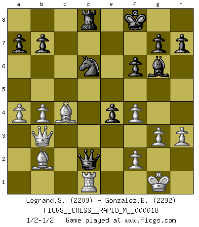 Last move : 1/2-1/2 2009 October 13 5:42:54 [Event "FICGS__CHESS__RAPID_M__000018"] [Site "FICGS"] [Date "2009.05.21"] [Round "1"] [White "Legrand,Stephane"] [Black "Gonzalez,Bolivar"] [Result "1/2-1/2"] [WhiteElo "2209"] [BlackElo "2292"] 1.d4 Nf6 2.c4 c5 3.Nf3 cxd4 4.Nxd4 e5 5.Nb5 d5 6.cxd5 Bc5 7.N5c3 O-O 8.h3 Bf5 9.e3 Bg6 10.a3 Nbd7 11.b4 Bd6 12.Bb2 Nb6 13.Be2 Rc8 14.O-O Bb8 15.Qb3 e4 16.Rd1 Qd6 17.g3 Qd7 18.Bf1 Rfd8 19.Ne2 Nfxd5 20.Nbc3 Qe6 21.Nxd5 Nxd5 22.Rac1 Nc7 23.Qc3 Ne8 24.Rxd8 Rxd8 25.Nf4 Bxf4 26.exf4 Qd6 27.Qe3 f6 28.Bc4+ Kf8 29.a4 Qd2 30.Qb3 Nd6 31.Rd1 1/2-1/2 Benoni defense Kingside Castling by player Black (move 7) Kingside Castling by player White (move 14) This chess game ended in a draw. Follow this game move after move (download)Via the squares on the chessboard, the Indians explain the movement of time and the age, the higher influences which control the world and the ties which link Chess with the human soul. (Al-Masudi) Der zweitbeste Zug ist oft der einzig richtige. (Savielly Grigorievitsch Tartakower) Yo no creo en la psicología. Yo creo en las buenas movidas. (Bobby Fischer) Seul un grand joueur sait à quel point il joue faiblement. (Xavier Tartacover) Control your own destiny or someone else will. (Jack Welch)