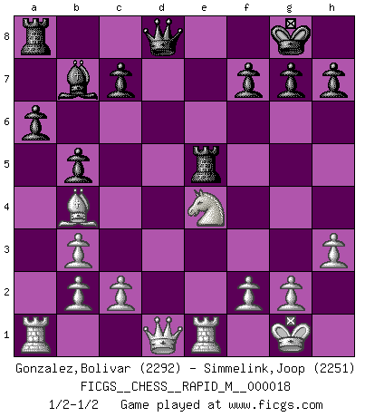 Last move : 1/2-1/2 2009 June 6 15:52:24 [Event "FICGS__CHESS__RAPID_M__000018"] [Site "FICGS"] [Date "2009.05.21"] [Round "1"] [White "Gonzalez,Bolivar"] [Black "Simmelink,Joop"] [Result "1/2-1/2"] [WhiteElo "2292"] [BlackElo "2251"] 1.e4 e5 2.Nf3 Nc6 3.Bb5 a6 4.Ba4 Nf6 5.O-O Be7 6.Re1 b5 7.Bb3 O-O 8.h3 Bb7 9.d3 d5 10.exd5 Nxd5 11.Nxe5 Nd4 12.Bd2 Re8 13.Nc3 Nxb3 14.axb3 Bd6 15.d4 Nb4 16.Ne4 Bxe5 17.dxe5 Rxe5 18.Bxb4 1/2-1/2 Ruy Lopez : Closed, 7...O-O Kingside Castling by player White (move 5) Kingside Castling by player Black (move 7) This chess game ended in a draw. Follow this game move after move (download)The enormous mental resilience, without which no Chess player can exist, was so much taken up by Chess that he could never free his mind of this game. (Albert Einstein) Nie in meinem Leben habe ich die französische Verteidigung gespielt, welche die Stumpfsinnigste von allen ist. (Wilhelm Steinitz) Yo considero que Fischer es uno de los expertos mas grandes de aperturas de siempre. (Keith Hayward) Ne tendez aucun piège pour le plaisir ! Ne jouez rien dans l'espoir que l'adversaire réagisse de façon stupide ! Prenez toujours pour acquis que l'adversaire va trouver le meilleur coup ! Ne jouez jamais de coup dans l'espoir que l'adversaire ne voie pas la menace ! Chacun de vos coups doit améliorer la position d'une façon ou d'une autre. Sometimes it pays to stay in bed in Monday, rather than spending the rest of the week debugging Monday's code. (Dan Salomon)