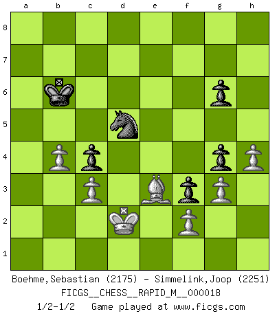 Last move : 1/2-1/2 2009 August 5 8:3:49 [Event "FICGS__CHESS__RAPID_M__000018"] [Site "FICGS"] [Date "2009.05.21"] [Round "1"] [White "Boehme,Sebastian"] [Black "Simmelink,Joop"] [Result "1/2-1/2"] [WhiteElo "2175"] [BlackElo "2251"] 1.e4 e5 2.Nf3 Nc6 3.Bb5 a6 4.Ba4 Nf6 5.O-O Be7 6.Re1 b5 7.Bb3 O-O 8.c3 d5 9.exd5 Nxd5 10.Nxe5 Nxe5 11.Rxe5 c6 12.d3 Bd6 13.Re1 Qh4 14.g3 Qh3 15.Re4 Qf5 16.Nd2 Qg6 17.Re1 f5 18.a4 f4 19.Ne4 Bg4 20.Qd2 Bc7 21.axb5 axb5 22.Rxa8 Rxa8 23.Bd1 h5 24.Bxg4 hxg4 25.Qe2 f3 26.Qf1 Re8 27.h3 Re5 28.h4 Bd8 29.Nc5 Rxe1 30.Qxe1 Be7 31.Qe6+ Qxe6 32.Nxe6 c5 33.Bg5 Bd6 34.Kf1 c4 35.dxc4 bxc4 36.Nd8 Bc7 37.Ke1 Bxd8 38.Bxd8 Kf7 39.Kd2 g6 40.Bg5 Ke6 41.Kc2 Kd6 42.b3 Kc5 43.b4+ Kb5 44.Kd2 Kb6 45.Be3+ 1/2-1/2 Ruy Lopez : Closed, 7...O-O Kingside Castling by player White (move 5) Kingside Castling by player Black (move 7) This chess game ended in a draw. Follow this game move after move (download)You know, comrade Pachman, I don't enjoy being a Minister, I would rather play Chess like you. (Che Guevara) Es tut gut, die Entwicklungsperiode von, [...] demokratischem Geist durchdringen zu lassen. Wie undemokratisch wäre es doch beispielsweise, den einen Offizier große Spaziertouren vornehmen zu lassen, während die anderen zu Hause säßen und sich entsetzlich langweilten. (Aaron Nimzowitsch) Yo no creo en la psicología. Yo creo en las buenas movidas. (Bobby Fischer) Même si vous avez un bon coup à faire, regardez toujours s'il n'y en a pas un qui lui soit préférable. (Pedro Damiano) A good teacher is like a candle - it consumes itself to light the way for others. (Author unknown)