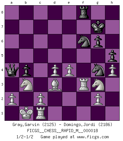 Last move : 1/2-1/2 2009 September 11 16:4:50 [Event "FICGS__CHESS__RAPID_M__000018"] [Site "FICGS"] [Date "2009.05.21"] [Round "1"] [White "Gray,Garvin"] [Black "Domingo,Jordi"] [Result "1/2-1/2"] [WhiteElo "2125"] [BlackElo "2186"] 1.e4 e5 2.Nf3 d6 3.d4 exd4 4.Nxd4 Nf6 5.Nc3 Be7 6.Bf4 O-O 7.Qd2 c6 8.O-O-O b5 9.f3 b4 10.Nce2 c5 11.Nb3 c4 12.Nbd4 Qa5 13.Kb1 Bd7 14.Ng3 c3 15.Qd3 g6 16.Nb3 Qa4 17.Bxd6 Bxd6 18.Qxd6 Be6 19.f4 Nbd7 20.bxc3 Rab8 21.Qd4 Rfd8 22.Be2 Ne8 23.f5 Ndf6 24.fxe6 Rxd4 25.exf7+ Kxf7 26.cxd4 Kg7 27.Rhf1 Rc8 28.Rd2 h5 29.h4 Qc6 30.Bd3 Ng4 31.Rf3 Nef6 32.Rd1 Rf8 33.Rc1 a5 34.Nxa5 Qa4 35.Nb3 1/2-1/2 Philidor : Exchange variation Kingside Castling by player Black (move 6) Queenside Castling by player White (move 8) This chess game ended in a draw. Follow this game move after move (download)Chess demands total concentration. (Bobby Fischer) Konzentriere dich auf materielle Gewinne. Nimm, was dir dein Gegner gibt, ausser es gibt einen guten Grund der dagegenspricht. (Robert James Fischer) Mis oponentes también hacen buenas movidas. A veces yo no tomo esas cosas en consideración. (Bobby Fischer) La guerre est enfant de la passion, la passion est enfant du narcissisme et le narcissisme est l'enfant. (...) Une autre partie ? (Thibault de Vassal) Once you start thinking you have nothing left to learn, you have everything to learn. (Steve Badget)