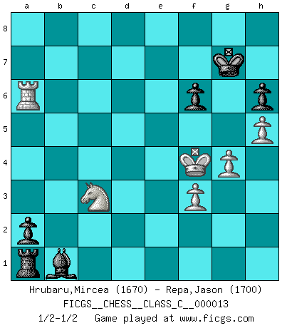Last move : 1/2-1/2 2007 June 30 21:5:11 [Event "FICGS__CHESS__CLASS_C__000013"] [Site "FICGS"] [Date "2006.09.13"] [Round "1"] [White "Hrubaru,Mircea"] [Black "Repa,Jason"] [Result "1/2-1/2"] [WhiteElo "1670"] [BlackElo "1700"] 1.e4 e6 2.d4 d5 3.Nd2 c5 4.Ngf3 Nc6 5.exd5 exd5 6.Bb5 Bd6 7.dxc5 Bxc5 8.Nb3 Bd6 9.O-O Nge7 10.Re1 O-O 11.Bd3 Re8 12.c4 dxc4 13.Bxc4 Bf5 14.Nbd4 Nxd4 15.Qxd4 Qc7 16.Bd2 Rad8 17.Qc3 Nc6 18.Bd5 Rxe1+ 19.Rxe1 h6 20.Qb3 Bg6 21.Bc3 Bc5 22.Bxg7 Kxg7 23.Qc3+ Nd4 24.Nxd4 Kh7 25.b4 Rxd5 26.bxc5 Qxc5 27.Qxc5 Rxc5 28.f3 Ra5 29.Re7 Rxa2 30.Rxb7 a5 31.Ra7 Kg7 32.h3 a4 33.Kh2 Ra1 34.Kg3 a3 35.Nb5 a2 36.Nc3 Bb1 37.Kf4 Kf6 38.h4 Kg6 39.h5+ Kf6 40.g4 Kg7 41.Ke5 Kg8 42.Ra6 Kg7 43.Ra8 f6+ 44.Kf4 Kf7 45.Ra6 Kg7 1/2-1/2 French : Tarrasch, Open variation Kingside Castling by player White (move 9) Kingside Castling by player Black (move 10) This chess game ended in a draw. Follow this game move after move (download)Of all my Russian books, the defense contains and diffuses the greatest 'warmth' which may seem odd seeing how supremely abstract Chess is supposed to be. (Vladimir Nabokov) Jede Eröffnung ist gut genug um gespielt zu werden, wenn nur ihr Ruf schlecht genug ist. (Savielly Grigorievitsch Tartakower) Yo he agregado estos principios a la ley: pongan los Caballos en acción antes de que los dos Alfiles sean desarrollados. (Emanuel Lasker) Soyez une menace à chaque fois que vous vous asseyez pour jouer. (Ken Smith) Shallow men believe in luck. Strong men belive in cause and effect. (Ralph Waldo Emerson)