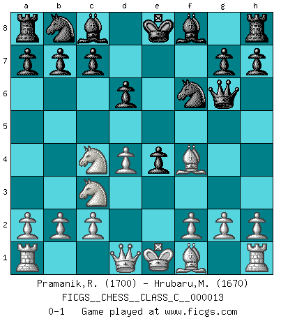 Last move : 0-1 2006 November 10 3:57:16 [Event "FICGS__CHESS__CLASS_C__000013"] [Site "FICGS"] [Date "2006.09.13"] [Round "1"] [White "Pramanik,Ranadeep"] [Black "Hrubaru,Mircea"] [Result "0-1"] [WhiteElo "1700"] [BlackElo "1670"] 1.e4 e5 2.Nf3 f5 3.Nxe5 Qf6 4.d4 d6 5.Nc4 fxe4 6.Nc3 Qg6 7.Bf4 Nf6 0-1 This chess game has been lost on time (started : 2006.09.13 0:8:16) Latvian counter-gambit Player Black won this chess game. Follow this game move after move (download)Chess makes man wiser and clear-sighted. (Vladimir Putin) Smyslow ist ein Beweis dafür, dass ich noch zehn Jahre spielen kann! [der 75 jährige über den 85 jährigen] (Viktor Kortschnoi) En el tablero, la mentira e hipocresía no sobreviven mucho. (Emanuel Lasker) Shah mat. Le roi est mort. Cri de fierté d'un joueur venant de terrasser son adversaire, courtoisement, sans effusion de sang. There is a great deal of difference between an eager man who wants to read a book and a tired man who wants a book to read. (G.K. Chesterton)