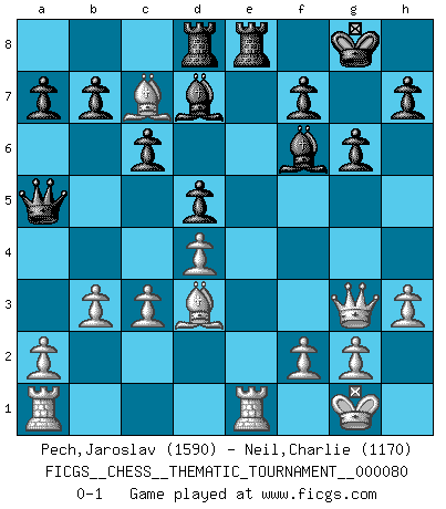 Last move : 0-1 2009 September 4 22:12:33 [Event "FICGS__CHESS__THEMATIC_TOURNAMENT__000080"] [Site "FICGS"] [Date "2009.05.22"] [Round "1"] [White "Pech,Jaroslav"] [Black "Neil,Charlie"] [Result "0-1"] [WhiteElo "1590"] [BlackElo "1170"] 1.e4 e5 2.Nf3 Nc6 3.Bb5 Nd4 4.Bc4 Nf6 5.Nxd4 exd4 6.O-O d6 7.c3 Be7 8.cxd4 Nxe4 9.Nc3 Nxc3 10.dxc3 O-O 11.Qf3 Bf6 12.Re1 c6 13.Bf4 d5 14.Bd3 Bd7 15.h3 Qb6 16.Bd6 Rfe8 17.b3 Rad8 18.Qg3 g6 19.Bc7 Qa5 0-1 This chess game has been lost on time (started : 2009.05.22 3:16:46) Ruy Lopez : Bird's defense Kingside Castling by player White (move 6) Kingside Castling by player Black (move 10) Player Black won this chess game. Follow this game move after move (download)It is no time to be playing Chess when the house is on fire. (Italian Proverb) Ein Teil des Fehlers ist immer korrekt. (Savielly Grigorievitsch Tartakower) La vida es como el Ajedrez, con lucha, competición y eventos buenos y malos. (Benjamin Franklin) Donnez-moi un Cavalier en 6e et je gagnerais toutes mes parties. (Steinitz) A specialist learns more and more about less and less until he knows everything about nothing. (Nicholas Murray Butler)