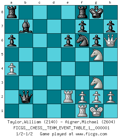 Last move : 1/2-1/2 2009 October 22 19:29:24 [Event "FICGS__CHESS__TEAM_EVENT_TABLE_1__000001"] [Site "FICGS"] [Date "2009.05.22"] [Round "1"] [White "Taylor,William"] [Black "Aigner,Michael"] [Result "1/2-1/2"] [WhiteElo "2140"] [BlackElo "2604"] 1.e4 g6 2.d4 Bg7 3.Nc3 d6 4.Be3 a6 5.Qd2 Nd7 6.Nf3 b5 7.a4 b4 8.Ne2 Ngf6 9.Ng3 O-O 10.Qxb4 c5 11.Qd2 d5 12.Bd3 Bb7 13.exd5 Nxd5 14.Be4 N7f6 15.Bxd5 Nxd5 16.Bh6 Bxh6 17.Qxh6 Qa5+ 18.c3 cxd4 19.O-O dxc3 20.Ng5 Nf6 21.bxc3 Qxc3 22.Rac1 Qd4 23.Rce1 e6 24.Re3 Qb2 25.Re2 1/2-1/2 Robatsch (Modern) defense Kingside Castling by player Black (move 9) Kingside Castling by player White (move 19) This chess game ended in a draw. Follow this game move after move (download)The older I grow, the more I value pawns. (Paul Keres) Die jungen Leute sollen verstehen, dass sie noch etwas von mir lernen können und müssen. (Viktor Kortschnoi) El jugador de combinación piensa hacia adelante; comienza de la posición dada y trabaja las movidas contundentes en su mente. (Emanuel Lasker) Dans le domaine de la peinture, de la gravure et de la sculpture, dès la première décennie de notre siècle, les artistes abandonnent la représentation de la partie d'échecs pour se concentrer sur les pièces, sur les échiquiers et sur toutes les variations auxquelles les unes et les autres peuvent donner lieu. On passe en quelque sorte d'un thème social à un thème musical (au sens de la musica médiévale, c'est-à-dire d'une notion qui inclue le rythme, l'harmonie, la construction et la déconstruction, etc.). Graphiquement et picturalement, l'échiquier apparaît comme une structure ouverte, dynamique, d'une richesse infinie, autorisant toutes les combinatoires et débouchant sur des mouvements et des rythmes de nature exponentielle. (Michel Pastoureau) When you stop learning you start dying. (M. Scott Adams)