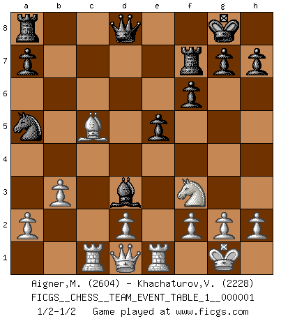 Last move : 1/2-1/2 2009 August 7 11:24:27 [Event "FICGS__CHESS__TEAM_EVENT_TABLE_1__000001"] [Site "FICGS"] [Date "2009.05.22"] [Round "1"] [White "Aigner,Michael"] [Black "Khachaturov,Vadim"] [Result "1/2-1/2"] [WhiteElo "2604"] [BlackElo "2228"] 1.e4 e5 2.Nf3 Nc6 3.Bc4 Nf6 4.Ng5 d5 5.exd5 Na5 6.Bb5+ c6 7.dxc6 bxc6 8.Bd3 Nd5 9.Nf3 Bd6 10.O-O Nf4 11.Nc3 Nxd3 12.cxd3 O-O 13.Ne4 c5 14.b3 Ba6 15.Re1 f6 16.Ba3 Bxd3 17.Nxc5 Bxc5 18.Bxc5 Rf7 19.Rc1 1/2-1/2 Two knights defense Kingside Castling by player White (move 10) Kingside Castling by player Black (move 12) This chess game ended in a draw. Follow this game move after move (download)I feel as if I were a piece in a game of Chess, when my opponent says of it: That piece cannot be moved. (Soren Kierkegaard) Wenn du auf das Glück wartest, wird das Leben ziemlich langweilig. (Mikhail Nekhemyevich Tal) El Peón aislado arroja penumbra sobre todo el tablero. (Aaron Nimzovich) Toute estimation doit être constamment réévaluée. (Jacob Estrin) . 'gn is not allowed in chess unless n is an integer between 1 and 8 inclusive, where 1 and 8 are to interpreted as the standard numerals standing for integers in the ordered real-closed field R, with the *canonical* ordering. (As opposed to, say, an integer in the domain Z[2+i*sqrt(5)] or an integer in some exotic Grothendieck topos). (Normajean Yates)