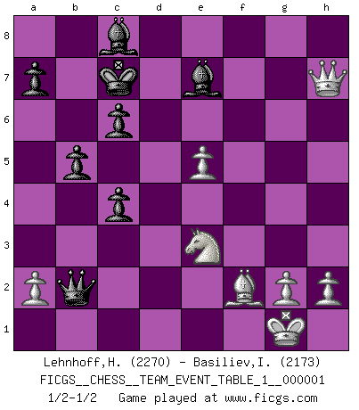 Last move : 1/2-1/2 2009 November 7 17:46:1 [Event "FICGS__CHESS__TEAM_EVENT_TABLE_1__000001"] [Site "FICGS"] [Date "2009.05.22"] [Round "1"] [White "Lehnhoff,Heinz-Georg"] [Black "Basiliev,Iouri"] [Result "1/2-1/2"] [WhiteElo "2270"] [BlackElo "2173"] 1.d4 d5 2.c4 c6 3.Nf3 Nf6 4.Nc3 e6 5.Bg5 h6 6.Bh4 dxc4 7.e4 g5 8.Bg3 b5 9.Be2 Bb7 10.O-O Nbd7 11.Ne5 Be7 12.f4 O-O 13.fxg5 hxg5 14.Qc2 Nxe5 15.Bxe5 Nd7 16.Bg3 e5 17.dxe5 Nc5 18.Rad1 Qa5 19.Bh5 Rad8 20.Qf2 Rxd1 21.Nxd1 Bc8 22.Bxf7+ Kg7 23.Ne3 Nxe4 24.Qc2 Rxf7 25.Rxf7+ Kxf7 26.Qxe4 Qd2 27.Qh7+ Ke8 28.Qg8+ Bf8 29.Qg6+ Kd8 30.Qxg5+ Be7 31.Qg8+ Kc7 32.Bf2 Qxb2 33.Qh7 1/2-1/2 QGD Slav : 4.Nc3 Kingside Castling by player White (move 10) Kingside Castling by player Black (move 12) This chess game ended in a draw. Follow this game move after move (download)When you don't know what to do, wait for your opponent to get an idea - it's sure to be wrong. (Tarrasch) Ich habe kein Problem mit Frauen, sondern nur mit dem Niveau ihres Schachspiels (Judith Polgar) En el tablero, la mentira e hipocresía no sobreviven mucho. (Emanuel Lasker) Shah mat. Le roi est mort. Cri de fierté d'un joueur venant de terrasser son adversaire, courtoisement, sans effusion de sang. Are you threatening me, Master Jedi ? (Chancellor Palpatine in Star Wars ep.3)