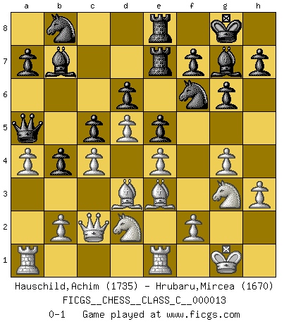 Last move : 0-1 2007 January 10 11:26:42 [Event "FICGS__CHESS__CLASS_C__000013"] [Site "FICGS"] [Date "2006.09.13"] [Round "1"] [White "Hauschild,Achim"] [Black "Hrubaru,Mircea"] [Result "0-1"] [WhiteElo "1735"] [BlackElo "1670"] 1.d4 Nf6 2.Nf3 c5 3.d5 b5 4.c4 Bb7 5.a4 Qa5+ 6.Bd2 b4 7.Qc2 g6 8.e4 d6 9.Bd3 Nbd7 10.O-O Bg7 11.h3 O-O 12.Be3 Rae8 13.Nbd2 e5 14.Nb3 Qa6 15.Nc1 Nh5 16.Ne2 Qa5 17.Rfe1 Re7 18.Nd2 Rfe8 19.g4 Nhf6 20.Ng3 Nb8 0-1 Queen's pawn game Kingside Castling by player White (move 10) Kingside Castling by player Black (move 11) Player Black won this chess game. Follow this game move after move (download)A player surprised is half beaten. (Proverb) Dass jemand wie Surab Asmaiparaschwili, der selbst Elopunkte gekauft hat , Vize-Präsident der Fide werden konnte, sagt schon einges über den Zustand dieser Organisation aus. (Joel Lautier) Todos los Maestros de Ajedrez fueron un día unos principiantes. (Chernev) Aucun coup ne doit être joué sans but. (Pedro Damiano) If you are going through hell, keep going. (Winston Churchill)