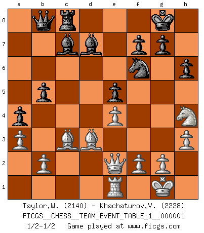 Last move : 1/2-1/2 2009 November 7 2:28:42 [Event "FICGS__CHESS__TEAM_EVENT_TABLE_1__000001"] [Site "FICGS"] [Date "2009.05.22"] [Round "1"] [White "Taylor,William"] [Black "Khachaturov,Vadim"] [Result "1/2-1/2"] [WhiteElo "2140"] [BlackElo "2228"] 1.e4 e5 2.Nf3 Nc6 3.Bb5 a6 4.Ba4 Nf6 5.O-O Be7 6.Re1 b5 7.Bb3 d6 8.c3 O-O 9.h3 Na5 10.Bc2 c5 11.d4 Qc7 12.Nbd2 cxd4 13.cxd4 Nc6 14.a3 Bd7 15.Nb3 a5 16.Be3 a4 17.Nbd2 Rfe8 18.Rc1 Qb7 19.Qe2 Rab8 20.dxe5 Nxe5 21.Bd4 Bd8 22.Nxe5 dxe5 23.Bc3 Bc7 24.Bb1 h6 25.Bb4 Rbc8 26.Bd3 Bb6 27.Rxc8 Rxc8 28.Nf3 Qb8 29.Bc3 Bc7 30.Nh4 1/2-1/2 Ruy Lopez : Closed Kingside Castling by player White (move 5) Kingside Castling by player Black (move 8) This chess game ended in a draw. Follow this game move after move (download)It began to feel as though you were playing against Chess itself. - On playing against Robert Fischer. (Walter Shipman) Das Zentrum ist der Balkan des Schachbretts - Kriegshandlungen können in jedem Moment ausbrechen. (Aaron Nimzowitsch) Debes de llevar a tu oponente hacia un profundo y obscuro bosque donde 2+2=5, y el camino que conduce a la salida es suficientemente ancho para solamente uno. (Mikhail Tal) Le moment que je préfère le plus dans une rencontre, c'est celui où je sens que la personnalité de l'adversaire se brise. (Robert Fischer) If passion drives you, let reason holds the reins. (Benjamin Franklin)