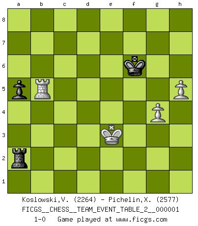 Last move : 1-0 2010 February 5 14:0:17 [Event "FICGS__CHESS__TEAM_EVENT_TABLE_2__000001"] [Site "FICGS"] [Date "2009.05.22"] [Round "1"] [White "Koslowski,Volker"] [Black "Pichelin,Xavier"] [Result "1-0"] [WhiteElo "2264"] [BlackElo "2577"] 1.e4 e5 2.Nf3 Nf6 3.d4 Nxe4 4.Bd3 d5 5.Nxe5 Nd7 6.Nxd7 Bxd7 7.O-O Bd6 8.c4 c6 9.cxd5 cxd5 10.Nc3 Nxc3 11.bxc3 O-O 12.Qh5 g6 13.Qxd5 Qc7 14.Bh6 Rfe8 15.h3 Be6 16.Qg5 Qxc3 17.Rfd1 Rad8 18.Bb5 Bd7 19.Rac1 Qa3 20.Bc4 Bf8 21.Bxf8 Qxf8 22.Qa5 Re7 23.Bb3 b6 24.Qg5 Rde8 25.Qg3 Rc8 26.Qf4 Bb5 27.Rxc8 Qxc8 28.d5 Qf5 29.Qxf5 gxf5 30.d6 Rd7 31.Kh2 Kg7 32.Kg3 Rd8 33.Kf4 Kf6 34.f3 h6 35.g4 fxg4 36.fxg4 a5 37.h4 Bd7 38.Rd2 Rg8 39.Rg2 Kg7 40.Bd5 Rc8 41.Re2 Rc5 42.Bxf7 Kxf7 43.Re7+ Kf6 44.Rxd7 Rc4+ 45.Kf3 Ke6 46.Rh7 Rc3+ 47.Ke2 Kxd6 48.Rxh6+ Ke5 49.Rxb6 Rc2+ 50.Ke3 Rxa2 51.Rb5+ Kf6 52.h5 1-0 Thibault de Vassal Congrats Volker, nice game! Petrov : Modern attack, Symmetrical variation Kingside Castling by player White (move 7) Kingside Castling by player Black (move 11) 10 pieces endgame at move 47 : White KRPPP , Black KRPPP WHITE : King + 1 Rook 3 Pawns BLACK : King + 1 Rook 3 Pawns 9 pieces endgame at move 48 : White KRPPP , Black KRPP WHITE : King + 1 Rook 3 Pawns BLACK : King + 1 Rook 2 Pawns 8 pieces endgame at move 49 : White KRPPP , Black KRP WHITE : King + 1 Rook 3 Pawns BLACK : King + 1 Rook 1 Pawn 7 pieces endgame at move 50 : White KRPP , Black KRP WHITE : King + 1 Rook 2 Pawns BLACK : King + 1 Rook 1 Pawn Player White won this chess game. Follow this game move after move (download)Chess is a cold bath for the mind. (Sir John Simon) Die unerbitterlichsten Regeln im Schach sind die Ausnahmen. (Savielly Grigorievitsch Tartakower) No nos podemos resistir a la fascinación de un sacrificio ya que la pasión por los sacrificios es parte de la naturaleza de un jugador de Ajedrez. (Rudolf Spielman) Il vaut toujours mieux jouer un plan faux de façon logique que de n'avoir pas de plan du tout. (Victor Kortchnoï) A proverb is a short sentence based on long experience. (Miguel de Cervantes)
