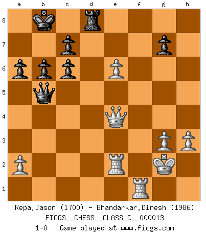 Last move : 1-0 2006 December 26 18:4:1 [Event "FICGS__CHESS__CLASS_C__000013"] [Site "FICGS"] [Date "2006.09.13"] [Round "1"] [White "Repa,Jason"] [Black "Bhandarkar,Dinesh"] [Result "1-0"] [WhiteElo "1700"] [BlackElo "1986"] 1.e4 e5 2.Nf3 Nc6 3.Bb5 a6 4.Bxc6 dxc6 5.O-O f6 6.d4 Bg4 7.c3 Bd6 8.Be3 Ne7 9.Nbd2 Qd7 10.dxe5 fxe5 11.h3 Bh5 12.Nxe5 Bxe5 13.Qxh5+ Ng6 14.f4 Qd3 15.Rae1 Bf6 16.f5 O-O-O 17.fxg6 hxg6 18.Qxg6 Bh4 19.Qg4+ Kb8 20.g3 Bf6 21.Nb3 b6 22.Bd4 Bxd4+ 23.Nxd4 Rxd4 24.cxd4 Qxd4+ 25.Kh1 Qxb2 26.Re2 Qe5 27.Kg2 Rd8 28.Rf5 Qa1 29.Rf1 Qd4 30.e5 Qd3 31.Qe4 Qb5 32.e6 1-0 Ruy Lopez : Exchange, Gligoric variation Kingside Castling by player White (move 5) Queenside Castling by player Black (move 16) Player White won this chess game. Follow this game move after move (download)Pawns: they are the soul of this game, they alone form the attack and defense. (Philidor) Über die Verhaftung Bobby Fischers: Warum es die Bush-Administration für nötig befindet einen 61 Jahre alten Mann zu hetzten, der für niemanden ausser sich selbste eine Gefahr darstellt ist ein Rätsel. (Nigel Short) Cada Peón es una Reina en potencia. (James Mason) Tout change constamment, y compris dans le monde des Echecs. (Botvinnik) Philosophers use a language that is already deformed as though by shoes that are too tight. (Ludwig Wittgenstein)