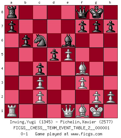 Last move : 0-1 2009 August 10 6:29:47 [Event "FICGS__CHESS__TEAM_EVENT_TABLE_2__000001"] [Site "FICGS"] [Date "2009.05.22"] [Round "1"] [White "Inving,Yugi"] [Black "Pichelin,Xavier"] [Result "0-1"] [WhiteElo "1345"] [BlackElo "2577"] 1.e4 e5 2.Nf3 Nf6 3.Nxe5 d6 4.Nd3 Nxe4 5.Nc3 Nf6 6.Nf4 d5 7.d4 Nc6 8.Be3 Bf5 9.Be2 Bb4 10.O-O Qd7 11.a3 Bxc3 12.bxc3 O-O 13.Rb1 Na5 14.Nd3 b6 15.Ne5 Qd6 16.f3 Qxa3 17.Qd2 Nd7 18.Nxd7 Bxd7 19.Bf4 c6 20.Rfe1 Rfe8 21.Ra1 Qf8 22.Bd3 c5 23.Re5 Rxe5 24.dxe5 Be6 25.Qe1 c4 26.Bf1 Nc6 0-1 Petrov's defense Kingside Castling by player White (move 10) Kingside Castling by player Black (move 12) Player Black won this chess game. Follow this game move after move (download)Even the laziest King flees wildly in the face of a double check ! (Aaron Nimzowitsch) Was ist der Unterschied zwischen einem Strassenarbeiter und einem Schachspieler? --Der Schachspieler bewegt sich ab und zu. (Anonymous) Todo se encuentra en un estado de flujo y esto incluye al mundo del Ajedrez. (Mikhail Botvinnik) Ce n'est pas pour s'amuser qu'il joue aux échecs : il célèbre un culte. (Vladimir Nabokov) A shortcut is the longest distance between two points. (Don Groves)