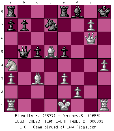 Last move : 1-0 2009 July 13 8:52:20 [Event "FICGS__CHESS__TEAM_EVENT_TABLE_2__000001"] [Site "FICGS"] [Date "2009.05.22"] [Round "1"] [White "Pichelin,Xavier"] [Black "Denchev,Stanimir"] [Result "1-0"] [WhiteElo "2577"] [BlackElo "1659"] 1.b4 e5 2.Bb2 d6 3.c4 Nf6 4.e3 Be7 5.Nc3 Be6 6.Nf3 O-O 7.Be2 Na6 8.a3 c5 9.b5 Nb8 10.Ng5 Nbd7 11.Qc2 h6 12.Nxe6 fxe6 13.g4 d5 14.cxd5 exd5 15.h4 d4 16.Na4 Re8 17.g5 Nd5 18.Bc4 dxe3 19.Bxd5+ Kh8 20.dxe3 Qa5+ 21.Bc3 Qxb5 22.gxh6 Bd6 23.Qg6 Bf8 24.hxg7+ 1-0 Polish (Sokolsky) opening Kingside Castling by player Black (move 6) Player White won this chess game. Follow this game move after move (download)No other master has such a terrific will to win. At the board he radiates danger, and even the strongest opponents tend to freeze, like rabbits when they smell a panther. Even his weaknesses are dangerous. As white, his opening game is predictable - you can make plans against it - but so strong that your plans almost never work. In the middle game his precision and invention are fabulous, and in the end game you simply cannot beat him. (Anonymous German Expert) Kein Schachspieler kann gut schlafen. (H. G. Wells) La esencia del Ajedrez es pensar acerca de lo que el Ajedrez es. (David Bronstein) Le succès, c'est être capable d'aller d'échec en échec sans perdre son enthousiasme. (Winston Churchill) A woman without a man is like a fish without a bicycle. (Gloria Steinem)