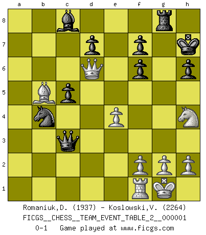 Last move : 0-1 2009 August 24 21:23:12 [Event "FICGS__CHESS__TEAM_EVENT_TABLE_2__000001"] [Site "FICGS"] [Date "2009.05.22"] [Round "1"] [White "Romaniuk,Dmytro"] [Black "Koslowski,Volker"] [Result "0-1"] [WhiteElo "1937"] [BlackElo "2264"] 1.d4 Nf6 2.c4 c5 3.d5 b5 4.cxb5 a6 5.bxa6 e6 6.Nc3 exd5 7.Nxd5 Nxa6 8.Bg5 Be7 9.Nxe7 Qxe7 10.e3 Qe5 11.Nf3 Qxb2 12.Bc4 h6 13.Bh4 O-O 14.O-O Nb4 15.a3 Rxa3 16.Bxf6 gxf6 17.Rxa3 Qxa3 18.Qd6 Qc3 19.Bb5 Kg7 20.e4 Rg8 21.Nh4 Kh7 0-1 Benko gambit accepted Kingside Castling by player Black (move 13) Kingside Castling by player White (move 14) Player Black won this chess game. Follow this game move after move (download)Chess mastery essentially consists of analyzing Chess positions accurately. (Mikhail Botvinnik) Obwohl ich alt bin, darf mir niemand den Finger in den Mund stecken, sonst beisse ich. (Wilhelm Steinitz) Aquel que toma al Peón de Caballo de la Reina, se pasará la noche a dormir en la calle. (Anónimo) La vie est comme un jeu d'échecs : nous esquissons un plan, mais celui-ci est tributaire de ce que daignent faire l'adversaire aux échecs et le destin dans la vie. (Arthur Schopenhauer) I'll be back. (Arnold Schwarzenegger)
