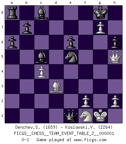 Last move : 0-1 2009 July 25 17:41:51 [Event "FICGS__CHESS__TEAM_EVENT_TABLE_2__000001"] [Site "FICGS"] [Date "2009.05.22"] [Round "1"] [White "Denchev,Stanimir"] [Black "Koslowski,Volker"] [Result "0-1"] [WhiteElo "1659"] [BlackElo "2264"] 1.d4 d5 2.c4 c6 3.Nf3 Nf6 4.Nc3 e6 5.Bg5 h6 6.Bxf6 Qxf6 7.e4 dxe4 8.Nxe4 Bb4+ 9.Ned2 c5 10.dxc5 Qxb2 11.Rb1 Qa3 12.Rb3 Qa5 13.a3 Bxc5 14.Bd3 O-O 15.O-O f5 16.Re1 Rd8 17.Ne5 Bxa3 18.Nf1 Bd6 19.Rb5 Qc7 20.Qh5 a6 21.Ra5 Rf8 22.Ng6 Qxa5 23.Nxf8 Bxf8 24.g4 Qxe1 25.gxf5 Nc6 26.f6 Ne5 27.fxg7 Bc5 0-1 QGD Slav : 4.Nc3 Kingside Castling by player Black (move 14) Kingside Castling by player White (move 15) Player Black won this chess game. Follow this game move after move (download)Alekhine is a poet who creates a work of art out of something that would hardly inspire another man to send home a picture post card. (Max Euwe) Ich verstehe mehr vom Schach als irgendein anderer lebender Meister. (José Raúl Capablanca) El Ajedrez demanda una total concentración. (Bobby Fischer) Tout change constamment, y compris dans le monde des Echecs. (Botvinnik) Strategy without tactics is the slowest route to victory. Tactics without strategy is the noise before defeat. (Sun Tzu)