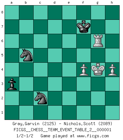 Last move : 1/2-1/2 2009 July 24 14:55:50 [Event "FICGS__CHESS__TEAM_EVENT_TABLE_2__000001"] [Site "FICGS"] [Date "2009.05.22"] [Round "1"] [White "Gray,Garvin"] [Black "Nichols,Scott"] [Result "1/2-1/2"] [WhiteElo "2125"] [BlackElo "2089"] 1.e4 e5 2.Nf3 Nc6 3.Bc4 Nf6 4.Ng5 Bc5 5.Bxf7+ Ke7 6.Bb3 Qe8 7.d3 d6 8.Nf3 Bg4 9.Be3 Qg6 10.Bxc5 dxc5 11.Nbd2 Rhf8 12.O-O Nh5 13.Nh4 Qg5 14.Ndf3 Rxf3 15.Nxf3 Qf6 16.h3 Bxf3 17.Qxf3 Qxf3 18.gxf3 Nd4 19.c3 Nxf3+ 20.Kg2 Nh4+ 21.Kh2 Nf3+ 22.Kh1 Nf4 23.Bd1 Nd2 24.Rg1 g6 25.Rg3 c4 26.d4 Rd8 27.Bc2 exd4 28.Rd1 dxc3 29.Rxc3 a6 30.Kh2 Rd6 31.b3 b5 32.e5 Rd5 33.bxc4 Nxc4 34.Rf3 Rxd1 35.Bxd1 Nd5 36.Bb3 Ke6 37.Rf8 Kxe5 38.Rh8 a5 39.Rxh7 a4 40.Bc2 Kf6 41.Kg3 c5 42.Rh6 Ne5 43.Rh8 c4 44.Rb8 Nc3 45.f4 Nd3 46.a3 b4 47.axb4 a3 48.b5 Nc5 49.Ra8 Nxb5 50.Kg4 Kg7 51.h4 Nb3 52.Kg5 N3d4 53.Bb1 Ne6+ 54.Kg4 c3 55.Be4 Ned4 56.Ra6 c2 57.Rxg6+ Kf7 58.Bxc2 Nxc2 1/2-1/2 Two knights defense : Wilkes Barre (Traxler) variation Kingside Castling by player White (move 12) 10 pieces endgame at move 57 : White KRBPP , Black KNNPP WHITE : King + 1 Rook 1 Bishop 2 Pawns BLACK : King + 2 Knights 2 Pawns 9 pieces endgame at move 58 : White KRBPP , Black KNNP WHITE : King + 1 Rook 1 Bishop 2 Pawns BLACK : King + 2 Knights 1 Pawn 8 pieces endgame at move 58 : White KRPP , Black KNNP WHITE : King + 1 Rook 2 Pawns BLACK : King + 2 Knights 1 Pawn This chess game ended in a draw. Follow this game move after move (download)Chess is a fairy tale of 1001 blunders. (Savielly Tartakower) Im Schach nämlich geht es darum, daß Ich des Gegners klein zu kriegen, sein Ego zu zerbrechen und zu zermahlen, seine Selbstachtung zu zertreten und zu verscharren und seine ganze mißachtenswerte sogenannte Persönlichkeit ein für alle Mal tot zu hacken und zu zerstampfen und dadurch die menschliche Gesellschaft von einer stinkenden Pestbeule zu befreien. Es ist ein königliches Spiel. (Robert James Fischer) La enorme capacidad mental, en la que sin ella no puede un jugador de Ajedrez existir, es demasiado requerida por el Ajedrez al grado de que nunca podrá liberar su mente de este juego. (Albert Einstein) La conception d'un plan est le processus par lequel un joueur exploite les avantages de sa position tout en s'efforçant d'en réduire au minimum les inconvénients. Afin de garantir le succès, un plan doit toujours se fonder sur un diagnostic objectif des particularités d'une position. La conception d'un plan est d'autant plus difficile que la position est équilibrée, et grandement facilitée lorsqu'il n'existe qu'un seul plan susceptible de répondre aux exigences de la position. (Harry Golombek) Humor is by far the most significant activity of the human brain. (Edward De Bono)
