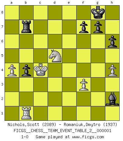 Last move : 1-0 2009 August 22 21:11:38 [Event "FICGS__CHESS__TEAM_EVENT_TABLE_2__000001"] [Site "FICGS"] [Date "2009.05.22"] [Round "1"] [White "Nichols,Scott"] [Black "Romaniuk,Dmytro"] [Result "1-0"] [WhiteElo "2089"] [BlackElo "1937"] 1.e4 c6 2.d4 d5 3.f3 e5 4.dxe5 Bc5 5.exd5 Qb6 6.Nh3 Bxh3 7.gxh3 cxd5 8.Qxd5 Bf2+ 9.Kd1 Nc6 10.Bd3 Nge7 11.Qe4 Bd4 12.Na3 Nxe5 13.Bb5+ N5c6 14.Bxc6+ bxc6 15.c3 Bf6 16.Nc4 Rd8+ 17.Kc2 Qa6 18.Be3 O-O 19.Bc5 Rd5 20.Bxe7 Bxe7 21.Rhd1 h6 22.h4 Qb5 23.a4 Qb7 24.Ne3 Rb8 25.b4 Rxd1 26.Rxd1 a5 27.b5 cxb5 28.Qxb7 Rxb7 29.Rb1 b4 30.Nd5 Bd6 31.cxb4 axb4 32.Kb3 Bxh2 33.Kc4 1-0 Caro-Kann : Tartakower (fantasy) variation Kingside Castling by player Black (move 18) Player White won this chess game. Follow this game move after move (download)Chess is really ninety nine percent calculation. (Soltis) Das typische an einem Großmeister ist, daß er eine gewonnene Position schnell und schmerzlos gewinnt. (Irving Chernev) Antes de los Finales, los dioses han colocado el Juego Medio. (Siegbert Tarrasch) Que feriez-vous si vous étiez en train de jouer aux échecs et que la fin du monde arrive ? Je continuerais à jouer. (Saint Borromée) Just because you do not take an interest in politics doesn't mean politics won't take an interest in you. (Pericles 430 B.C.)