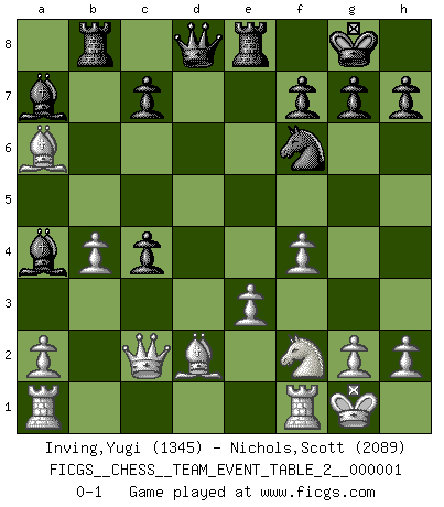 Last move : 0-1 2009 June 29 16:33:10 [Event "FICGS__CHESS__TEAM_EVENT_TABLE_2__000001"] [Site "FICGS"] [Date "2009.05.22"] [Round "1"] [White "Inving,Yugi"] [Black "Nichols,Scott"] [Result "0-1"] [WhiteElo "1345"] [BlackElo "2089"] 1.d4 Nf6 2.c4 e5 3.dxe5 Ng4 4.Nf3 Bc5 5.e3 Nc6 6.Nc3 O-O 7.Be2 Ncxe5 8.O-O Nxf3+ 9.Bxf3 Ne5 10.Be2 d6 11.f4 Nd7 12.Bf3 a6 13.Ne4 Ba7 14.Qd3 Re8 15.Bd2 Nf6 16.Nf2 Bd7 17.b4 d5 18.Qc2 dxc4 19.Bxb7 Rb8 20.Bxa6 Ba4 0-1 Budapest : Adler variation Kingside Castling by player Black (move 6) Kingside Castling by player White (move 8) Player Black won this chess game. Follow this game move after move (download)It was clear to me that the vulnerable point of the American Grandmaster (Bobby Fischer) was in double-edged, hanging, irrational positions, where he often failed to find a win even in a won position. (Efim Geller) Kritik überlasse ich den Spießern. Ich zeige nichts, wofür ich mich schämen muss. (Alexandra Kosteniuk) Si un gobernante no entiende al Ajedrez, ¿como puede governar él un reinado?. (El Rey Khusros II) Aux échecs, les retours au sommet sont rares : les dommages psychologiques consécutifs à une défaite sont trop sévères. (Daily Telegraph) The existence of forgetting has never been proved: We only know that some things don't come to mind when we want them. (Friedrich Nietzsche)