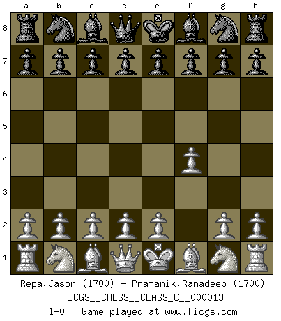Last move : 1-0 2006 December 25 20:17:17 [Event "FICGS__CHESS__CLASS_C__000013"] [Site "FICGS"] [Date "2006.09.13"] [Round "1"] [White "Repa,Jason"] [Black "Pramanik,Ranadeep"] [Result "1-0"] [WhiteElo "1700"] [BlackElo "1700"] 1.f4 1-0 This chess game has been lost on time (started : 2006.09.13 0:8:16) Bird's Opening Player White won this chess game. Follow this game move after move (download)You know, comrade Pachman, I don't enjoy being a Minister, I would rather play Chess like you. (Che Guevara) Es tut gut, die Entwicklungsperiode von, [...] demokratischem Geist durchdringen zu lassen. Wie undemokratisch wäre es doch beispielsweise, den einen Offizier große Spaziertouren vornehmen zu lassen, während die anderen zu Hause säßen und sich entsetzlich langweilten. (Aaron Nimzowitsch) Aún el Rey más flojo huye despavorido ante la amenaza de un Jaque doble. (Aaron Nimzowitsch) Vous m'avez demandé de vous exposer quel est le fondement de la prière. Je ne fais que préparer les pièces du jeu sur la table... Nous sera-t-il permis d'en adopter les règles et si nous les appliquons scrupuleusement nous ne tarderons pas à faire mat le Roi divin ! Il ne pourra échapper à nos mains. (Sainte Thérèse d'Avila, Chemin de perfection) Always remember that you are unique; just like everyone else. (Unknown)