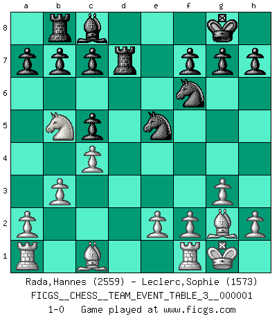 Last move : 1-0 2009 June 16 19:27:44 [Event "FICGS__CHESS__TEAM_EVENT_TABLE_3__000001"] [Site "FICGS"] [Date "2009.05.22"] [Round "1"] [White "Rada,Hannes"] [Black "Leclerc,Sophie"] [Result "1-0"] [WhiteElo "2559"] [BlackElo "1573"] 1.c4 e5 2.g3 Nc6 3.Bg2 Nf6 4.Nf3 Bc5 5.O-O O-O 6.Nxe5 Nxe5 7.d4 d6 8.dxc5 dxc5 9.Qxd8 Rxd8 10.b3 Rb8 11.Nc3 Rd7 12.Nb5 1-0 English Opening Kingside Castling by player White (move 5) Kingside Castling by player Black (move 5) Player White won this chess game. Follow this game move after move (download)You can only get good at Chess if you love the game. (Bobby Fischer) Man braucht nicht immer den besten Zug zu spielen: Ein Zug muß aktiv, unternehmungslustig, korrekt und schön sein. (David Bronstein) El Ajedrez demanda una total concentración. (Bobby Fischer) Le succès, c'est être capable d'aller d'échec en échec sans perdre son enthousiasme. (Winston Churchill) A married woman is like a fish riding a bicycle. (Rodolfo d'Ettorre)