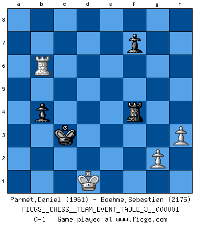 Last move : 0-1 2010 July 31 2:0:56 [Event "FICGS__CHESS__TEAM_EVENT_TABLE_3__000001"] [Site "FICGS"] [Date "2009.05.22"] [Round "1"] [White "Parmet,Daniel"] [Black "Boehme,Sebastian"] [Result "0-1"] [WhiteElo "1961"] [BlackElo "2175"] 1.e4 c5 2.Nf3 d6 3.b4 cxb4 4.d4 g6 5.a3 bxa3 6.Nxa3 Bg7 7.Bd3 Nc6 8.O-O Nf6 9.Re1 O-O 10.c3 a6 11.h3 Rb8 12.Nc4 b5 13.Ne3 e6 14.Ba3 Re8 15.c4 b4 16.Bb2 e5 17.dxe5 Nd7 18.Bc2 Ndxe5 19.Nxe5 Bxe5 20.Rb1 a5 21.Ba4 Bb7 22.Nd5 Re6 23.Bc1 Bh8 24.Nf4 Re8 25.Nd5 Bg7 26.f3 Re5 27.Bb2 Re6 28.Bxg7 Kxg7 29.Qd2 Rc8 30.f4 Nb8 31.Qd4+ Kg8 32.Qa7 Bc6 33.Bb5 Nd7 34.Ra1 Nf6 35.Bxc6 Rxc6 36.Qxa5 Qxa5 37.Rxa5 Rxc4 38.f5 gxf5 39.Nxf6+ Rxf6 40.exf5 h5 41.Rb5 d5 42.Rxd5 Rb6 43.f6 Rxf6 44.Rxh5 Rb6 45.Re8+ Kg7 46.R5h8 Rb7 47.Reg8+ Kf6 48.Rb8 R4c7 49.Rh6+ Ke5 50.Rb6 Rxb6 51.Rxb6 Rc4 52.Kf2 Kd4 53.Ke2 Kc3 54.Kd1 Rf4 0-1 Sicilian : wing gambit deferred Kingside Castling by player White (move 8) Kingside Castling by player Black (move 9) 10 pieces endgame at move 44 : White KRRPP , Black KRRPP WHITE : King + 2 Rooks 2 Pawns BLACK : King + 2 Rooks 2 Pawns 9 pieces endgame at move 50 : White KRPP , Black KRRPP WHITE : King + 1 Rook 2 Pawns BLACK : King + 2 Rooks 2 Pawns 8 pieces endgame at move 51 : White KRPP , Black KRPP WHITE : King + 1 Rook 2 Pawns BLACK : King + 1 Rook 2 Pawns Player Black won this chess game. Follow this game move after move (download)In life, as in Chess, one's own Pawns block one's way. A man's very wealth, ease, leisure, children, books, which should help him to win, more often checkmate him. (Charles Buxton) Es gibt Leute, die glauben, alles wäre vernünftig, was man mit einem ernsthaften Gesicht tut. (Georg Christoph Lichtenberg) El Ajedrez es un regaderazo frío para la mente. (Sir John Simon) J'apprécie les joueurs d'est-indienne, c'est grâce à eux que je nourris ma famille depuis tant d'années. (Petrosian) The ego is not master in its own house. (Sigmund Freud)