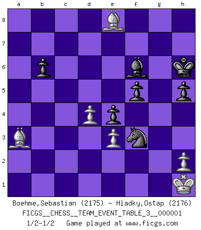 Last move : 1/2-1/2 2010 March 10 21:11:20 [Event "FICGS__CHESS__TEAM_EVENT_TABLE_3__000001"] [Site "FICGS"] [Date "2009.05.22"] [Round "1"] [White "Boehme,Sebastian"] [Black "Hladky,Ostap"] [Result "1/2-1/2"] [WhiteElo "2175"] [BlackElo "2176"] 1.d4 f5 2.g3 Nf6 3.c4 e6 4.Bg2 c6 5.Nf3 d5 6.Qc2 Bd6 7.Nc3 O-O 8.O-O Qe8 9.Rb1 Nbd7 10.c5 Bc7 11.b4 e5 12.b5 e4 13.Ng5 h6 14.Nh3 Rf7 15.e3 g5 16.Kh1 Nf8 17.Ng1 Bd7 18.a4 h5 19.f4 gxf4 20.gxf4 Rg7 21.Nh3 Ng4 22.Rg1 Ne6 23.Bd2 Kh8 24.Qb2 Rb8 25.Qa3 b6 26.cxb6 Bxb6 27.Rbc1 cxb5 28.axb5 Bxb5 29.Nxd5 Bd8 30.Nc3 Qd7 31.Nxb5 Qxb5 32.Rc2 Qb3 33.Qxb3 Rxb3 34.Bf1 Bf6 35.Bc4 Nxf4 36.Rxg4 Rb1+ 37.Bc1 Nxh3 38.Rxg7 Kxg7 39.Be6 Kg6 40.Bd7 Ng5 41.Be8+ Kh6 42.Rc6 Rb6 43.Rxb6 axb6 44.Ba3 Nf3 1/2-1/2 Dutch defense Kingside Castling by player Black (move 7) Kingside Castling by player White (move 8) This chess game ended in a draw. Follow this game move after move (download)Let the perfectionist play postal. (Yasser Seirawan) Weshalb minderdergeübte Spieler mit g2-g4 beginnen? Die betreffenden sind unschlüssig, ob sie nun rechts (h4) oder links (f4) beginnen sollen, und in ihrer Ratlosigkeit entschliessen sie sich nach guter Bürgerart dazu, den goldenen Mittelweg zu wählen. (Aaron Nimzowitsch) El jugador táctico debe saber que hacer cuando algo se debe de hacer. El estratégico debe saber que hacer cuando nada se debe de hacer. (Savielly Tartakover) Roi des jeux et jeu des rois, les échecs portent en eux un sentiment d'infini. Ils donnent à celui qui s'est efforcé d'en approfondir les arcanes l'impression de n'être pas à la mesure de l'homme; en fait, ils constituent un résumé de l'univers, un microcosme, et figurent cette grande échelle qui, dans les plans de la lumière descend jusqu'à la matière, qui des abîmes insondables remonte jusqu'en l'infini de Dieu. (Pyrame) There's always a bigger fish. (Qui-Gon Jinn in Star Wars ep.1)
