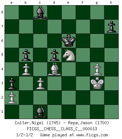 Last move : 1/2-1/2 2007 December 23 18:34:30 [Event "FICGS__CHESS__CLASS_C__000013"] [Site "FICGS"] [Date "2006.09.13"] [Round "1"] [White "Colter,Nigel"] [Black "Repa,Jason"] [Result "1/2-1/2"] [WhiteElo "1745"] [BlackElo "1700"] 1.e4 e6 2.Nf3 d5 3.Nc3 Nf6 4.e5 Nfd7 5.d4 c5 6.dxc5 Nc6 7.Bf4 Bxc5 8.Bd3 f6 9.exf6 Nxf6 10.Qe2 O-O 11.O-O Nh5 12.Bg5 Nf4 13.Qd2 Qd6 14.Nb5 Qb8 15.c3 Bd7 16.Nbd4 Nxd3 17.Qxd3 Ne5 18.Nxe5 Qxe5 19.Be3 Bd6 20.f4 Qh5 21.Nb5 Bb8 22.Rf3 a6 23.Nd4 e5 24.fxe5 Bxe5 25.h3 Bc7 26.Raf1 Rxf3 27.Rxf3 Rf8 28.Rxf8+ Kxf8 29.Nf3 Qf5 30.Qxf5+ Bxf5 31.Nd4 Bd7 32.Kf2 Kf7 33.g4 Bd6 34.Kf3 Kf6 35.Bf4 Be7 36.h4 Kf7 37.Bg3 a5 38.b3 b5 39.h5 a4 40.b4 g6 41.hxg6+ Kxg6 42.Ne2 Kg5 43.Bf4+ Kf6 44.Bg3 Kf7 45.Be5 Bg5 46.Bd4 Bd2 47.Nf4 Bc8 48.Kg3 Bb7 49.Nd3 Ke7 50.Ne5 Bc8 51.Nf3 Bc1 52.Ne5 Kd6 53.Kf3 Bd2 54.Ke2 Bf4 55.Nf7+ Ke7 56.Kf3 Bc1 57.Ne5 Ke6 58.Kg3 a3 1/2-1/2 French defense Kingside Castling by player Black (move 10) Kingside Castling by player White (move 11) This chess game ended in a draw. Follow this game move after move (download)Many have become Chess Masters, no one has become the Master of Chess. (Siegbert Tarrasch) Mein Name ist Rustam Kamsky. Sie haben meinen Sohn belästigt. Bereiten Sie sich aufs Sterben vor. (Rustam Kamsky) La batalla por la última verdad nunca sera ganada. Y es por eso que el Ajedrez es tan fascinante. (Hans Kmoch) Aux échecs, les retours au sommet sont rares : les dommages psychologiques consécutifs à une défaite sont trop sévères. (Daily Telegraph) Live, lose, and learn, by observing your opponent how to win. (Amber Steenbock)