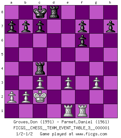 Last move : 1/2-1/2 2009 June 13 6:53:31 [Event "FICGS__CHESS__TEAM_EVENT_TABLE_3__000001"] [Site "FICGS"] [Date "2009.05.22"] [Round "1"] [White "Groves,Don"] [Black "Parmet,Daniel"] [Result "1/2-1/2"] [WhiteElo "1991"] [BlackElo "1961"] 1.e4 e5 2.Nf3 Nc6 3.d4 exd4 4.Nxd4 Bc5 5.Be3 Qf6 6.c3 Nge7 7.Qf3 Nxd4 8.Qxf6 Nc2+ 9.Kd2 Bxe3+ 10.fxe3 gxf6 11.Kxc2 d5 12.Bd3 dxe4 13.Bxe4 Bf5 14.Nd2 Rg8 15.g3 O-O-O 16.Bxf5+ Nxf5 17.Rae1 Rge8 18.Nc4 Re4 19.Rhf1 Nxg3 20.hxg3 Rxc4 1/2-1/2 Scotch game Queenside Castling by player Black (move 15) This chess game ended in a draw. Follow this game move after move (download)Whoever sees no other aim in the game than that of giving checkmate to one's opponent will never become a good Chess player. (Euwe) Darum geht es im Schach. Einen Tag gibst du deinem Gegner eine Lektion, am nächsten Tag gibt er dir eine. (Robert James Fischer) Con o sin el título, Bobby Fischer fue sin lugar a dudas el mas grande jugador de su época. (Burt Hochberg) Il s'avisa de me proposer d'apprendre les échecs qu'il jouait un peu... me voilà forcené des échecs. J'achète un échiquier, je m'enferme dans ma chambre, j'y passe des jours et des nuits à vouloir apprendre par cur toutes les parties. (Jean-Jacques Rousseau, Confessions) Who needs drugs and alcohol if he can play Big Chess at FICGS ? (Heinz-Georg Lehnhoff)