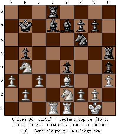 Last move : 1-0 2009 July 7 2:50:22 [Event "FICGS__CHESS__TEAM_EVENT_TABLE_3__000001"] [Site "FICGS"] [Date "2009.05.22"] [Round "1"] [White "Groves,Don"] [Black "Leclerc,Sophie"] [Result "1-0"] [WhiteElo "1991"] [BlackElo "1573"] 1.e4 c5 2.c3 Nc6 3.d4 d5 4.dxc5 dxe4 5.Qxd8+ Nxd8 6.Bb5+ Nc6 7.Nd2 Nf6 8.Ne2 a6 9.Ba4 e5 10.Nc4 Bxc5 11.Nxe5 b5 12.Bxb5 axb5 13.Nxc6 Bd7 14.Nb4 O-O-O 15.Be3 Be7 16.O-O h5 17.h3 Kb7 18.a3 h4 19.Rad1 Rh5 20.Rfe1 1-0 Sicilian : Alapin's variation (2.c3) Queenside Castling by player Black (move 14) Kingside Castling by player White (move 16) Player White won this chess game. Follow this game move after move (download)Nonsense was the last thing Fischer was interested in, as far as Chess was concerned. (Elie Agur) Dein Körper muss in Topform sein. Dein Schach verfällt, wenn dein Körper verfällt. Der Körper kann nicht vom Geist getrennt werden. (Robert James Fischer) Botvinnik trató de alejar el misterio referente al Ajedrez, siempre relacionandolo a situaciones de la vida diaria. Solía llamar al Ajedrez un problema inexacto típico, similar a aquellos en que la gente tiene siempre que resolver a cada día. (Garry Kasparov) Il a essayé de se convaincre qu'il pourrait empêcher toutes les erreurs et ne jamais perdre. L'horreur ! Gary Kasparov au sujet de Robert Fischer. . 'gn is not allowed in chess unless n is an integer between 1 and 8 inclusive, where 1 and 8 are to interpreted as the standard numerals standing for integers in the ordered real-closed field R, with the *canonical* ordering. (As opposed to, say, an integer in the domain Z[2+i*sqrt(5)] or an integer in some exotic Grothendieck topos). (Normajean Yates)