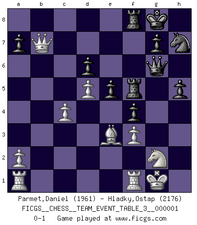 Last move : 0-1 2009 July 10 14:22:24 [Event "FICGS__CHESS__TEAM_EVENT_TABLE_3__000001"] [Site "FICGS"] [Date "2009.05.22"] [Round "1"] [White "Parmet,Daniel"] [Black "Hladky,Ostap"] [Result "0-1"] [WhiteElo "1961"] [BlackElo "2176"] 1.e4 Nc6 2.d4 e5 3.d5 Nce7 4.Nf3 Ng6 5.h4 h5 6.Bg5 Nf6 7.Nc3 Bb4 8.Be2 d6 9.O-O Bxc3 10.bxc3 Qd7 11.Qd3 Qa4 12.c4 Nh7 13.Be3 O-O 14.c5 f5 15.Qb3 Qxe4 16.cxd6 cxd6 17.c4 Nxh4 18.Ne1 Nxg2 19.Nxg2 f4 20.f3 Qg6 21.Bd3 Bf5 22.Bxf5 Rxf5 23.Qxb7 Raf8 0-1 KP : Nimzovich defense Kingside Castling by player White (move 9) Kingside Castling by player Black (move 13) Player Black won this chess game. Follow this game move after move (download)The Pin is mightier than the sword. (Fred Reinfeld) Schach ist das schnellste Spiel der Welt, weil man in jeder Sekunde Tausende von Gedanken ordnen muß. (Albert Einstein) La caracteristica mas importante en la posición del Ajedrez es la actividad de las piezas. Esto es absolutamente fundamental en todas las fases del juego: Apertura, Juego Medio y especialmente Finales. La limitación primordial en la actividad de una pieza, es la estructuración de los Peones. (Michael Stean) Le pion, dans sa simplicité, marche droit devant lui, mais lorsqu'il prend, il le fait obliquement? Ainsi l'homme, tant qu'il reste pauvre, marche dans la droiture et vit honnêtement, mais lorsqu'il recherche les honneurs, il flatte, se parjure et, par les voies obliques, cherche une position supérieure sur l'échiquier du monde. (Jean de Galles) Art is the triumph over chaos. (John Cheever)