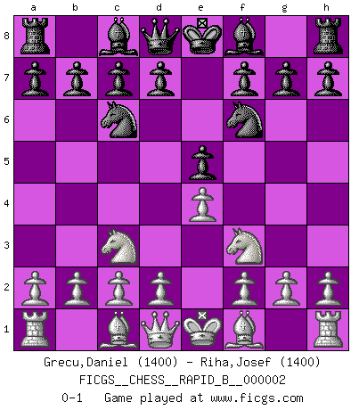 Last move : 0-1 2006 April 20 3:14:20 [Event "FICGS__CHESS__RAPID_B__000002"] [Site "FICGS"] [Date "2006.04.19"] [Round "1"] [White "Grecu,Daniel"] [Black "Riha,Josef"] [Result "0-1"] [WhiteElo "1400"] [BlackElo "1400"] 1.e4 e5 2.Nf3 Nf6 3.Nc3 Nc6 0-1 Petrov Three knights game Player Black won this chess game. Follow this game move after move (download)First-class players lose to second-class players because second-class players sometimes play a first-class game. (Siegbert Tarrasch) Jede Eröffnung ist gut genug um gespielt zu werden, wenn nur ihr Ruf schlecht genug ist. (Savielly Grigorievitsch Tartakower) Del Ajedrez se ha dicho que la vida no es lo suficientemente larga para él, pero eso es culpa de la vida, no del Ajedrez. (William Ewart Napier) Ce n'est pas pour s'amuser qu'il joue aux échecs : il célèbre un culte. (Vladimir Nabokov) The smarter you play, the luckier you'll be. (Mark Pilarski)