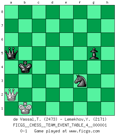 Last move : 0-1 2010 March 17 13:59:32 [Event "FICGS__CHESS__TEAM_EVENT_TABLE_4__000001"] [Site "FICGS"] [Date "2009.05.22"] [Round "1"] [White "de Vassal,Thibault"] [Black "Lemekhov,Yura"] [Result "0-1"] [WhiteElo "2473"] [BlackElo "2171"] 1.e4 c5 2.d4 cxd4 3.c3 dxc3 4.Nxc3 Nc6 5.Nf3 e6 6.Bc4 a6 7.O-O b5 8.Bb3 Bb7 9.Bf4 Nge7 10.Qe2 Ng6 11.Bg3 Be7 12.Rfd1 Na5 13.Bc2 Rc8 14.e5 Bxf3 15.Qxf3 Nc4 16.Bxg6 hxg6 17.Qe2 Rc6 18.a4 b4 19.Ne4 Qc7 20.Rac1 Qc8 21.b3 Nxe5 22.Rxc6 Nxc6 23.Bd6 a5 24.Qc4 Qd8 25.g3 Rh5 26.g4 Rh4 27.Bg3 Rh6 28.g5 Rh5 29.Qa6 f5 30.gxf6 gxf6 31.Qb7 e5 32.f4 f5 33.fxe5 fxe4 34.e6 Bc5+ 35.Kh1 Bd4 36.Bc7 Qf6 37.Qc8+ Ke7 38.Qxd7+ Kf8 39.e7+ Nxe7 40.Qxd4 Qf3+ 41.Kg1 Rg5+ 42.Bg3 Qxb3 43.Qh8+ Kf7 44.Qh7+ Ke8 45.Qh8+ Ng8 46.Qd4 Kf7 47.Rf1+ Rf5 48.Qxe4 Rxf1+ 49.Kxf1 Qd1+ 50.Kf2 Qd2+ 51.Kf1 Ne7 52.Qf3+ Ke8 53.Qa8+ Qd8 54.Qf3 Qd5 55.Qe2 b3 56.Be5 Kf7 57.Ke1 Qc6 58.Qf2+ Nf5 59.Qf4 Qc2 60.Bh8 b2 61.Bxb2 Qxb2 62.Qc7+ Ke6 63.Qc8+ Kd5 64.Qa8+ Kc4 65.Qxa5 Qc1+ 66.Kf2 Qe3+ 67.Kg2 Nh4+ 68.Kf1 Qf4+ 69.Ke2 Qxh2+ 70.Kd1 Qg1+ 71.Kc2 Qc5 72.Qa6+ Kb4 73.Kb1 g5 74.Qb7+ Kxa4 75.Qa8+ Qa5 76.Qg8 Nf3 77.Qa2+ Kb4 0-1 Thibault de Vassal I knew it would be a tough game, but I was completely outplayed, actually :) Sicilian : Smith-Morra gambit Kingside Castling by player White (move 7) 10 pieces endgame at move 61 : White KQBPP , Black KQNPP WHITE : King + 1 Queen 1 Bishop 2 Pawns BLACK : King + 1 Queen 1 Knight 2 Pawns 9 pieces endgame at move 61 : White KQPP , Black KQNPP WHITE : King + 1 Queen 2 Pawns BLACK : King + 1 Queen 1 Knight 2 Pawns 8 pieces endgame at move 65 : White KQPP , Black KQNP WHITE : King + 1 Queen 2 Pawns BLACK : King + 1 Queen 1 Knight 1 Pawn 7 pieces endgame at move 69 : White KQP , Black KQNP WHITE : King + 1 Queen 1 Pawn BLACK : King + 1 Queen 1 Knight 1 Pawn 6 pieces endgame at move 74 : White KQ , Black KQNP WHITE : King + 1 Queen BLACK : King + 1 Queen 1 Knight 1 Pawn Player Black won this chess game. Follow this game move after move (download)I won't play with you anymore. You have insulted my friend. - When an opponent cursed himself for a blunder. (Miguel Najdorf) Privat ist Kortschnoi kein schlechter Mensch, sehr sympathisch. Aber während des Spiels ist er grausam. Er will dich töten. (Miguel Najdorf) El tablero es el mundo, las piezas es el fenomeno del universo, las reglas del juego son lo que llamamos leyes de la naturaleza y el jugador del lado opuesto, se encuentra oculto a nuestra vista. (Thomas Huxley) Aux échecs, l'amour-propre est satisfait quand on remporte la victoire, mais il n'y a pas de honte à être battu. (Benjamin Franklin) If we don't succeed, we run the risk of failure. (George W. Bush)