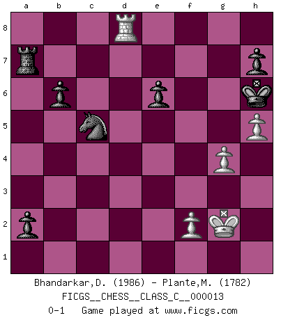 Last move : 0-1 2006 December 8 13:27:3 [Event "FICGS__CHESS__CLASS_C__000013"] [Site "FICGS"] [Date "2006.09.13"] [Round "1"] [White "Bhandarkar,Dinesh"] [Black "Plante,Marc-Eric"] [Result "0-1"] [WhiteElo "1986"] [BlackElo "1782"] 1.e4 c5 2.d4 cxd4 3.c3 Nf6 4.e5 Nd5 5.Nf3 e6 6.cxd4 b6 7.Nc3 Nxc3 8.bxc3 Qc7 9.Bd2 Bb7 10.Bd3 d6 11.O-O Nd7 12.Ng5 dxe5 13.Qh5 g6 14.Qh3 Be7 15.Rfe1 Bd5 16.c4 Bxc4 17.Qf3 O-O 18.Nxf7 Bxd3 19.Nh6+ Kh8 20.Qxd3 Qd6 21.Be3 exd4 22.Qxd4+ Qxd4 23.Bxd4+ Bf6 24.Rad1 Bxd4 25.Rxd4 Nc5 26.Ng4 Rad8 27.Red1 Rxd4 28.Rxd4 g5 29.g3 Rf3 30.Ne3 Rf7 31.Kg2 Rd7 32.Rg4 Rd2 33.Rxg5 Rxa2 34.Ng4 Rd2 35.h4 Rd7 36.Nh6 Rg7 37.Re5 a5 38.h5 a4 39.Re3 Ra7 40.Re1 a3 41.Rd1 a2 42.Rd8+ Kg7 43.g4 Kxh6 0-1 Sicilian : Smith-Morra gambit Kingside Castling by player White (move 11) Kingside Castling by player Black (move 17) Player Black won this chess game. Follow this game move after move (download)Fischer is completely natural. He plays no roles. He's like a child. Very, very simple. (Zita Rajcsanyi) Als ich elf wurde, wurde ich einfach gut. (Robert James Fischer) El Ajedrez demanda una total concentración. (Bobby Fischer) Karpov est une pièce de musée. (Garry Kasparov) Fame, I have already. Now I need the money. (an elderly Steinitz)