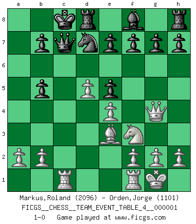 Last move : 1-0 2009 June 15 16:41:57 [Event "FICGS__CHESS__TEAM_EVENT_TABLE_4__000001"] [Site "FICGS"] [Date "2009.05.22"] [Round "1"] [White "Markus,Roland"] [Black "Orden,Jorge"] [Result "1-0"] [WhiteElo "2096"] [BlackElo "1101"] 1.e4 c5 2.c3 d6 3.d4 cxd4 4.cxd4 Nc6 5.Nf3 Bg4 6.d5 Ne5 7.Nxe5 dxe5 8.Qxg4 Nf6 9.Bb5+ Nd7 10.Nd2 Qc7 11.O-O O-O-O 12.Nf3 a6 13.Be3 axb5 14.Rac1 1-0 Sicilian : Alapin's variation (2.c3) Kingside Castling by player White (move 11) Queenside Castling by player Black (move 11) Player White won this chess game. Follow this game move after move (download)There is only one thing Fischer does in Chess without pleasure: to lose ! (Boris Spassky) Zum Sieg gelangt man nicht, wenn man gut, sondern nur wenn man besser spielt (Savielly Grigorievitsch Tartakower) Aquel que ve no otra dirección en el juego que la de dar Jaque Mate a su oponente, nunca será un buen jugador de Ajedrez. (Euwe) Votre seul travail dans les ouvertures est d'obtenir un milieu de partie jouable. (Lajos Portish) An expert is a man who has made all the mistakes which can be made in a very narrow field. (Niels Bohr)