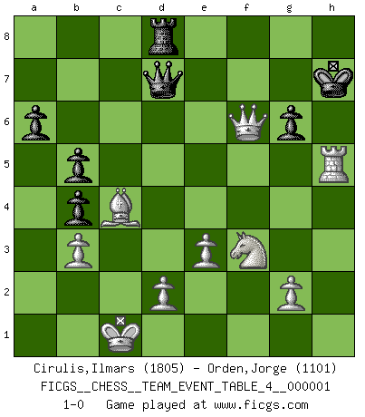 Last move : 1-0 2009 September 10 23:34:25 [Event "FICGS__CHESS__TEAM_EVENT_TABLE_4__000001"] [Site "FICGS"] [Date "2009.05.22"] [Round "1"] [White "Cirulis,Ilmars"] [Black "Orden,Jorge"] [Result "1-0"] [WhiteElo "1805"] [BlackElo "1101"] 1.c4 c5 2.f4 g6 3.Nc3 Bg7 4.Nf3 e6 5.b3 Ne7 6.Bb2 O-O 7.e3 a6 8.Qc2 Nbc6 9.Ne4 Nb4 10.Qc1 Nf5 11.Bxg7 Kxg7 12.Qb2+ f6 13.a3 b6 14.axb4 d5 15.Ng3 cxb4 16.cxd5 Nxg3 17.hxg3 Qxd5 18.g4 e5 19.fxe5 Bxg4 20.exf6+ Rxf6 21.Rxh7+ Kxh7 22.Qxf6 Rd8 23.Bc4 Qd7 24.O-O-O b5 25.Rh1+ Bh5 26.Rxh5+ 1-0 English : Symmetrical variation Kingside Castling by player Black (move 6) Queenside Castling by player White (move 24) Player White won this chess game. Follow this game move after move (download)Fischer was a master of clarity and a king of artful positioning. His opponents would see where he was going but were powerless to stop him. (Bruce Pandolfini) Ihnen, Herr Lasker, habe ich nur drei Worte zu sagen: Schach und matt. (Siegbert Tarrasch) Un mal día en el Ajedrez, es mejor que cualquier buen día en el trabajo. (Anonymous) Toutes choses étant égales, c'est la conviction qui gagne. Alliée à une volonté de vaincre, elle sert de détonateur, suscite des idées, disperse les doutes et aide à penser clairement. (Robert Fischer) Knowledge rests not upon truth alone, but upon error also. (Carl G. Jung)