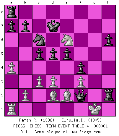 Last move : 0-1 2009 December 18 18:21:42 [Event "FICGS__CHESS__TEAM_EVENT_TABLE_4__000001"] [Site "FICGS"] [Date "2009.05.22"] [Round "1"] [White "Raman,Ranganathan"] [Black "Cirulis,Ilmars"] [Result "0-1"] [WhiteElo "1396"] [BlackElo "1805"] 1.e4 c5 2.Nf3 Nc6 3.c3 Nf6 4.Ng5 h6 5.Nf3 Nxe4 6.Bd3 d5 7.O-O g5 8.Na3 g4 9.Nh4 e5 10.g3 Ng5 11.Kg2 Be6 12.Be2 Qd7 13.d3 Nh3 14.Bd2 Be7 15.Nb5 Bxh4 16.gxh4 f5 17.Qe1 f4 18.f3 Rg8 19.Kh1 g3 20.hxg3 Rxg3 21.a4 Qe7 22.Rf2 Nxf2+ 23.Qxf2 Qxh4+ 24.Qh2 Rh3 25.Nc7+ Kd7 26.Nxe6 Rxh2+ 27.Kg1 Qf2+ 0-1 Sicilian defense Kingside Castling by player White (move 7) Player Black won this chess game. Follow this game move after move (download)Chess is not like life... it has rules ! (Mark Pasternak) Es gibt zwei Arten von Opfern: Korrekte und meine. (Mikhail Nekhemyevich Tal) Los Peones son el alma de una partida de Ajedrez. (Francois Andre Danican Philidor) Il (Jacob Murray) ne joue pas pour le bon coup, mais pour le meilleur. (Eloi Relange) If you don't practice you don't deserve to win. (Andre Agassi)
