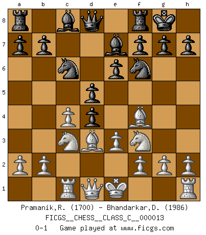 Last move : 0-1 2006 November 7 9:30:35 [Event "FICGS__CHESS__CLASS_C__000013"] [Site "FICGS"] [Date "2006.09.13"] [Round "1"] [White "Pramanik,Ranadeep"] [Black "Bhandarkar,Dinesh"] [Result "0-1"] [WhiteElo "1700"] [BlackElo "1986"] 1.d4 d5 2.c4 e6 3.Nf3 Nf6 4.Nc3 Be7 5.Bf4 O-O 6.e3 c5 7.Bd3 Nc6 8.Rc1 cxd4 0-1 This chess game has been lost on time (started : 2006.09.13 0:8:16) Queen's gambit declined Kingside Castling by player Black (move 5) Player Black won this chess game. Follow this game move after move (download)Chess is a forcing house where the fruits of character can ripen more fully than in life. (Edward Morgan Foster) Über Kasparov: Es ist offensichtlich, daß er in einem totalitären Staat aufwuchs und deshalb zu diktatorischen Zügen neigt. (Viktor Kortschnoi) La enorme capacidad mental, en la que sin ella no puede un jugador de Ajedrez existir, es demasiado requerida por el Ajedrez al grado de que nunca podrá liberar su mente de este juego. (Albert Einstein) Il n'y a pas de prix trop élevé au scalp de l'ennemi. (Koblentz) God, you are such an idiot. - Actually, I thought I was more of a jerk. (Gregory House to Stacy Warner, House M.D.)