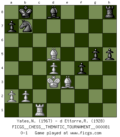 Last move : 0-1 2009 December 10 20:23:32 [Event "FICGS__CHESS__THEMATIC_TOURNAMENT__000081"] [Site "FICGS"] [Date "2009.05.24"] [Round "1"] [White "Yates,Normajean"] [Black "d Ettorre,Rodolfo"] [Result "0-1"] [WhiteElo "1967"] [BlackElo "1928"] 1.e4 e5 2.f4 exf4 3.Nc3 Qh4+ 4.Ke2 d5 5.Nxd5 Bg4+ 6.Nf3 Bd6 7.d4 Nc6 8.Kd3 Qh6 9.c3 O-O-O 10.Kc2 Kb8 11.h3 Be6 12.g3 Bxd5 13.exd5 Nce7 14.c4 Nf5 15.Bd3 Nxg3 16.Rg1 Qxh3 17.c5 Be7 18.Bxf4 Nf5 19.d6 cxd6 20.Kb1 h6 21.c6 Rc8 22.cxb7 Rc7 23.Bf1 Qh5 24.Ba6 Nh4 25.Nxh4 Qxh4 26.Qf3 g5 27.Be3 Nf6 28.Rc1 Rxc1+ 29.Kxc1 Qe4 30.Qxe4 Nxe4 31.Kc2 d5 32.Rf1 Nd6 33.Kd3 Bd8 34.Rc1 Nxb7 35.Bb5 h5 36.Bc6 f5 37.Bxd5 f4 0-1 KGA : Keres (Mason-Steinitz) gambit Queenside Castling by player Black (move 9) Player Black won this chess game. Follow this game move after move (download)Bobby is the most misunderstood, misquoted celebrity walking the face of this earth. (Yasser Seirawan) Am wohlsten fühle ich mich, wenn ich sehe, wie sich mein Gegner im Todeskampf windet. (Robert James Fischer) Las leyes del Ajedrez no permiten una libre elección: tienes que mover quieras o no. (Emanuel Lasker) Une platitude souvent récitée à propos des Echecs est qu'une des choses les plus difficiles à réaliser est de gagner une position gagnante. Cela ne manque pas de sens mais, pour ma part, j'ai toujours trouvé plus difficile de gagner une position perdante. (Tim Krabbe) For a mechanic, you seem to do an excessive amount of thinking. (C-3PO in Star Wars ep.2)
