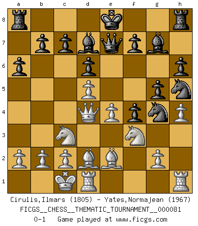 Last move : 0-1 2009 August 18 12:42:54 [Event "FICGS__CHESS__THEMATIC_TOURNAMENT__000081"] [Site "FICGS"] [Date "2009.05.24"] [Round "1"] [White "Cirulis,Ilmars"] [Black "Yates,Normajean"] [Result "0-1"] [WhiteElo "1805"] [BlackElo "1967"] 1.e4 e5 2.f4 exf4 3.Nc3 Nc6 4.Nf3 g5 5.h3 Bg7 6.d4 h6 7.d5 Ne5 8.Bd2 d6 9.Qe2 a6 10.O-O-O Bd7 11.h4 Qe7 12.Qf2 Nf6 13.Be2 Neg4 14.Qd4 Nh5 0-1 KGA : Keres (Mason-Steinitz) gambit Queenside Castling by player White (move 10) Player Black won this chess game. Follow this game move after move (download)Don't even mention losing to me. I can't stand to think of it. (Bobby Fischer) Rauchen ist dem Schachspieler bei seiner Arbeit, also im Wettkampf, untersagt. (Viktor Kortschnoi) No todos los artistas son jugadores de Ajedrez, pero todos los jugadores de Ajedrez son artistas. (Marcel Duchamp) La tactique est l'élément le plus important du milieu de jeu. (Siegbert Tarrasch) The best weapon against an enemy is another enemy. (Friedrich Nietzsche)