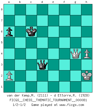 Last move : 1/2-1/2 2009 December 28 15:42:19 [Event "FICGS__CHESS__THEMATIC_TOURNAMENT__000081"] [Site "FICGS"] [Date "2009.05.24"] [Round "1"] [White "van der Kemp,Michel"] [Black "d Ettorre,Rodolfo"] [Result "1/2-1/2"] [WhiteElo "2111"] [BlackElo "1928"] 1.e4 e5 2.f4 exf4 3.Nc3 d6 4.d4 Qh4+ 5.Ke2 Bg4+ 6.Nf3 f5 7.Bxf4 Nc6 8.exf5 O-O-O 9.g3 Qh5 10.Kf2 Nf6 11.Be2 Qxf5 12.d5 Ne5 13.Nd4 Qg6 14.Bxg4+ Nfxg4+ 15.Kg2 h5 16.h3 Nf6 17.Re1 Re8 18.h4 a6 19.Qd2 Nfg4 20.Ne6 Be7 21.b4 c6 22.Rab1 Kb8 23.Ne4 Rc8 24.Rbc1 cxd5 25.Qxd5 Nf6 26.Nxf6 gxf6 27.c4 Nd3 28.Kh1 Rhg8 29.Re3 Nxb4 30.Bxd6+ Ka8 31.Bxb4 Bxb4 32.c5 Qh6 33.c6 Qxe3 34.cxb7+ Kb8 35.bxc8Q+ Rxc8 36.Rxc8+ Kxc8 37.Nf4 Bc5 38.Qa8+ Kd7 39.Qb7+ Kd8 40.Kh2 Qg1+ 41.Kh3 Bd6 42.Qa8+ Ke7 43.Nxh5 Qf1+ 44.Qg2 Qf5+ 45.g4 Qd3+ 46.Ng3 Kd8 47.Qa8+ Kc7 48.Qa7+ Kc6 49.Qf2 f5 50.gxf5 Bxg3 51.Qxg3 Qxf5+ 52.Qg4 Qd3+ 53.Kh2 1/2-1/2 KGA : Keres (Mason-Steinitz) gambit Queenside Castling by player Black (move 8) Promotion Queen by player White (move 35) 10 pieces endgame at move 50 : White KQNPPP , Black KQBP WHITE : King + 1 Queen 1 Knight 3 Pawns BLACK : King + 1 Queen 1 Bishop 1 Pawn 9 pieces endgame at move 50 : White KQPPP , Black KQBP WHITE : King + 1 Queen 3 Pawns BLACK : King + 1 Queen 1 Bishop 1 Pawn 8 pieces endgame at move 51 : White KQPPP , Black KQP WHITE : King + 1 Queen 3 Pawns BLACK : King + 1 Queen 1 Pawn 7 pieces endgame at move 51 : White KQPP , Black KQP WHITE : King + 1 Queen 2 Pawns BLACK : King + 1 Queen 1 Pawn This chess game ended in a draw. Follow this game move after move (download)No one ever won a game by resigning. (Unknown) Ich hatte meine größten Erfolge, als ich 47 Jahre alt war. Kasparow war noch nicht mal 42 und hat das Schach schon im Stich gelassen. (Viktor Kortschnoi) A través de las casillas del tablero, los Indios explican el movimiento del tiempo y la edad, las influencias mas altas que controlan el mundo y los lazos que vinculan al Ajedrez con el alma humana. (Al-Masudi) Les Echecs, c'est l'art de la guerre sans les charniers, c'est la résurrection des morts tombés au champ d'honneur, l'espoir perpétuel, la suprématie de l'intelligence sur la force, la culture de l'esprit. (F. Szpiner) The human is the only animal species whose members are able to talk themselves into difficulties that would not otherwise exist. (Wendell Johnson)