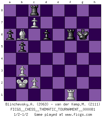 Last move : 1/2-1/2 2010 March 9 15:12:1 [Event "FICGS__CHESS__THEMATIC_TOURNAMENT__000081"] [Site "FICGS"] [Date "2009.05.24"] [Round "1"] [White "Blinchevsky,Alexander"] [Black "van der Kemp,Michel"] [Result "1/2-1/2"] [WhiteElo "2063"] [BlackElo "2111"] 1.e4 e5 2.f4 exf4 3.Nf3 d6 4.d4 g5 5.h4 g4 6.Ng5 h6 7.Nxf7 Kxf7 8.Bc4+ Kg7 9.Bxf4 Rh7 10.Qd3 Nc6 11.Nc3 a6 12.Rf1 b5 13.Bb3 Kh8 14.O-O-O Nge7 15.Be3 Bd7 16.e5 Bg7 17.e6 Be8 18.Qe2 Bh5 19.Nd5 Na5 20.Nf4 Qe8 21.d5 Rc8 22.Rd2 Nf5 23.Qd3 Nxh4 24.Bd4 Kg8 25.Bf2 Bg6 26.Qg3 Bf6 27.Qxg4 h5 28.Qe2 c5 29.dxc6 Nxb3+ 30.axb3 Nf5 31.g4 hxg4 32.Qxg4 Rg7 33.Ba7 Bh7 34.Nh5 Bxb2+ 35.Kxb2 Rxg4 36.Nf6+ Kg7 37.Nxe8+ Rxe8 38.c7 Re4 39.Rd5 Rc8 40.Bb6 Rxe6 41.R1xf5 Bxf5 42.Rxf5 Kg6 43.Rf1 Rf6 1/2-1/2 KGA : Fischer defense Queenside Castling by player White (move 14) This chess game ended in a draw. Follow this game move after move (download)The passed Pawn is a criminal, who should be kept under lock and key. Mild measures, such as police surveillance, are not sufficient. (Aaron Nimzovich) Die Idee von Capablanca, Schach als Fach in den Schulen zu lehren, ist großartig. (Fidel Castro) Yo creo que el Ajedrez posee una magia que es también una ayuda en la edad avanzada. Una rodilla reumática es olvidada durante una partida de Ajedrez y otros eventos pueden parecer algo sin importancia comparada a una catástrofe en el tablero de Ajedrez. (Vlastimil Hort) A ce moment-là, je menaçais de comprendre la position ! (Clément L'Heureux) The meaning of life is that it is to be lived, and it is not to be traded and conceptualized and squeezed into a pattern of systems. (Bruce Lee)