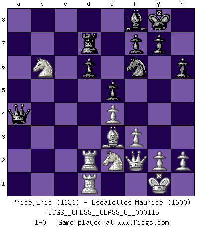 Last move : 1-0 2009 June 17 12:31:15 [Event "FICGS__CHESS__CLASS_C__000115"] [Site "FICGS"] [Date "2009.05.24"] [Round "1"] [White "Price,Eric"] [Black "Escalettes,Maurice"] [Result "1-0"] [WhiteElo "1631"] [BlackElo "1600"] 1.e4 c5 2.Nf3 d6 3.d4 cxd4 4.Nxd4 Nf6 5.Nc3 e5 6.Bb5+ Bd7 7.Bxd7+ Qxd7 8.Nde2 Be7 9.O-O O-O 10.f3 h6 11.Be3 Rd8 12.Qe1 Nc6 13.Rd1 Nb4 14.Qf2 b6 15.Rd2 Qe6 16.a3 Nc6 17.Rfd1 Na5 18.b3 Nxb3 19.cxb3 Qxb3 20.a4 Rac8 21.Nb5 Qxa4 22.Nxa7 Rd7 23.Nxc8 Bf8 24.Nxb6 1-0 Sicilian : Venice attack Kingside Castling by player White (move 9) Kingside Castling by player Black (move 9) Player White won this chess game. Follow this game move after move (download)There just isn't enough televised Chess. (David Letterman) Über Karpov: Er war und ist ein Vertreter der russischen Reaktionäre. Das steckt tief in seiner Seele, wehalb ich nicht nett mit ihm umgehen kann. (Viktor Kortschnoi) Siempre es mejor sacrificar los hombres de tu oponente. (Savielly Tartakower) Le plus grand jeu de l'esprit jamais inventé, plus vous l'apprenez, plus vous y prenez du plaisir. (Garry Kasparov) If you are good, you will be assigned all the work. If you are really good, you will get out of it. (Dan Rotaru)