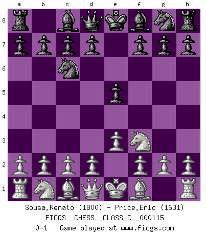 Last move : 0-1 2009 July 5 9:48:16 [Event "FICGS__CHESS__CLASS_C__000115"] [Site "FICGS"] [Date "2009.05.24"] [Round "1"] [White "Sousa,Renato"] [Black "Price,Eric"] [Result "0-1"] [WhiteElo "1800"] [BlackElo "1631"] 1.e3 e5 2.Nf3 Nc6 0-1 This chess game has been lost on time (started : 2009.05.24 13:52:7) Van't Kruijs Opening Player Black won this chess game. Follow this game move after move (download)Some sacrifices are sound; the rest are mine. (Mikhail Tal) Im Hotelzimmer gab es nur zwei Schaben. (Über die Turnierbedingungen) (Peter Swidler) Un buen jugador siempre tiene buena suerte. (José Raúl Capablanca) Si je n'étais pas joueur d'échecs, je serais le meilleur dans quelque chose d'autre. (Anatoli Karpov) Art disturbs, science reassures. (Georges Braque, Le Jour et la Nuit)