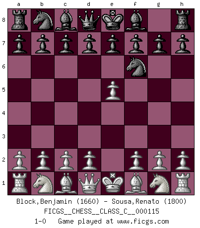 Last move : 1-0 2009 July 5 21:57:37 [Event "FICGS__CHESS__CLASS_C__000115"] [Site "FICGS"] [Date "2009.05.24"] [Round "1"] [White "Block,Benjamin"] [Black "Sousa,Renato"] [Result "1-0"] [WhiteElo "1660"] [BlackElo "1800"] 1.e4 Nf6 2.e5 1-0 This chess game has been lost on time (started : 2009.05.24 13:52:7) Alekhine's defense Player White won this chess game. Follow this game move after move (download)Chess is a fighting game which is purely intellectual and includes chance. (Richard Reti) Wer sich die Fähigkeit anerziehen will im Schach selbstständig zu denken, der muß alles meiden, was leblos ist: ausgeklügelte Theorien, die sich auf sehr wenige Beispiele und eine Menge Hirngespinste stützen. (Emanuel Lasker) No existe un remordimiento como el remordimiento del Ajedrez. (H. G. Wells) La solitude du joueur d'Echecs à l'approche du mat est semblable à celle du condamné. (Francis Szpiner) Creativity is allowing yourself to make mistakes. Art is knowing which ones to keep. (Scott Adams)