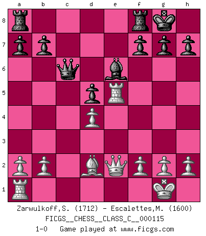 Last move : 1-0 2009 August 22 9:10:31 [Event "FICGS__CHESS__CLASS_C__000115"] [Site "FICGS"] [Date "2009.05.24"] [Round "1"] [White "Zarwulkoff,Steve"] [Black "Escalettes,Maurice"] [Result "1-0"] [WhiteElo "1712"] [BlackElo "1600"] 1.e4 c5 2.c3 Nf6 3.e5 Nd5 4.d4 d6 5.Nf3 cxd4 6.cxd4 Nc6 7.Bc4 dxe5 8.Nxe5 e6 9.O-O Be7 10.Re1 O-O 11.Nc3 Bf6 12.Nxd5 exd5 13.Bb5 Qb6 14.Bxc6 Bxe5 15.Rxe5 Qxc6 16.Qe2 Be6 17.Bd2 1-0 Sicilian : Alapin's variation (2.c3) Kingside Castling by player White (move 9) Kingside Castling by player Black (move 10) Player White won this chess game. Follow this game move after move (download)After black's reply to 1.e4 with 1..e5, leaves him always trying to get into the game. (Howard Staunton) Es genügt nicht ein guter Spieler zu sein, man muß auch gut spielen. (Siegbert Tarrasch) El Ajedrez, como cualquier actividad creativa, solo puede existir a través del esfuerzo combinado de aquellos que tienen talento creativo y de aquellos que poseen la habilidad de organizar su trabajo creativo. (Mikhail Botvinnik) La tactique, c'est ce que vous faites quand il y a quelque chose à faire; la stratégie, c'est ce que vous faites quand il n'y a rien à faire. (Savielli Tartacower) Live, lose, and learn, by observing your opponent how to win. (Amber Steenbock)