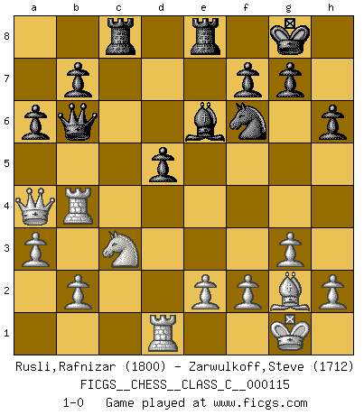 Last move : 1-0 2009 August 18 20:58:36 [Event "FICGS__CHESS__CLASS_C__000115"] [Site "FICGS"] [Date "2009.05.24"] [Round "1"] [White "Rusli,Rafnizar"] [Black "Zarwulkoff,Steve"] [Result "1-0"] [WhiteElo "1800"] [BlackElo "1712"] 1.d4 d5 2.c4 e6 3.Nf3 c5 4.cxd5 exd5 5.g3 Nc6 6.Bg2 Nf6 7.O-O Be7 8.Nc3 O-O 9.Bg5 cxd4 10.Nxd4 h6 11.Be3 Re8 12.a3 Be6 13.Qa4 Nxd4 14.Bxd4 a6 15.Rfd1 Rc8 16.Rd2 Bc5 17.Rad1 Bxd4 18.Rxd4 Qb6 19.Rb4 1-0 This chess game has been lost on time (started : 2009.05.24 13:52:7) Queen's gambit declined Kingside Castling by player White (move 7) Kingside Castling by player Black (move 8) Player White won this chess game. Follow this game move after move (download)I know people who have all the will in the world, but still can't play good Chess. (Bobby Fischer) Ich bin der einzige Schachspieler, der sich während der Vorbereitungen zum Turnier verletzt hat. (Woody Allen) Sin errores no puede haber brillantez. (Emanuel Lasker) On n'a jamais que l'âge auquel on a commence à jouer aux échecs car après on cesse de vieillir. (Capablanca) Information on the Internet is subject to the same rules and regulations as conversation at a bar. (George Lundberg)