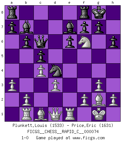 Last move : 1-0 2009 July 4 1:23:26 [Event "FICGS__CHESS__RAPID_C__000074"] [Site "FICGS"] [Date "2009.05.24"] [Round "1"] [White "Plunkett,Louis"] [Black "Price,Eric"] [Result "1-0"] [WhiteElo "1533"] [BlackElo "1631"] 1.c4 e6 2.Nf3 Nf6 3.Nc3 c5 4.g3 b6 5.Bg2 Bb7 6.O-O Be7 7.d3 O-O 8.e4 h6 9.e5 Ne8 10.Re1 d6 11.exd6 Nxd6 12.Qc2 Nf5 13.Ne4 Nc6 14.a3 Ncd4 15.Nxd4 Nxd4 16.Qd1 Qd7 17.Rb1 Qc6 18.Nf6+ 1-0 English Opening Kingside Castling by player White (move 6) Kingside Castling by player Black (move 7) Player White won this chess game. Follow this game move after move (download)The isolated Pawn casts gloom over the entire chessboard. (Aaron Nimzovich) Spielt Blackmar-Diemer-Gambit, und das Matt kommt von selbst! (Emil Joseph Diemer) Evita las multitudes. Haz independientemente tu propio razonamiento. Trata de ser el jugador de Ajedrez, no la pieza de Ajedrez. (Ralph Charell) Les écrivains ont utilisé les échecs pour analyser les côtés extrêmes de la nature humaine. Dans ce cadre, les échecs offrent un champ d'expérimentation idéal. Mais on pourrait faire la même chose avec la peinture. Et là, en vous référant à Van Gogh, vous ne tirerez pas de conclusion définitive sur les peintres. (Gary Kasparov) Wisdom doesn't necessarily come with age. Sometimes age just shows up all by itself. (Tom Watson)