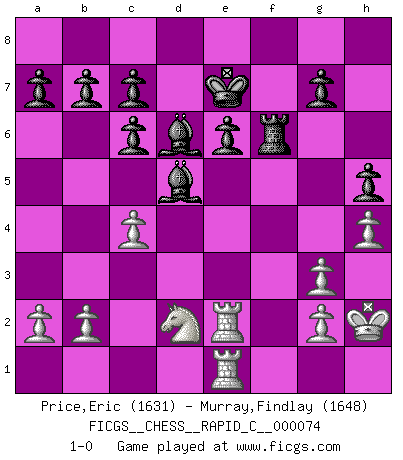 Last move : 1-0 2009 June 8 16:18:51 [Event "FICGS__CHESS__RAPID_C__000074"] [Site "FICGS"] [Date "2009.05.24"] [Round "1"] [White "Price,Eric"] [Black "Murray,Findlay"] [Result "1-0"] [WhiteElo "1631"] [BlackElo "1648"] 1.e4 e5 2.Nf3 Nc6 3.Bb5 Nf6 4.O-O Nxe4 5.d4 Nd6 6.Bxc6 dxc6 7.dxe5 Nf5 8.Qxd8+ Kxd8 9.Nc3 Ke8 10.h3 Be7 11.Bf4 Nh4 12.Nd4 Nf5 13.Nde2 h5 14.Ne4 Be6 15.Ng5 Bc4 16.Rfe1 Rd8 17.Ng3 Nxg3 18.fxg3 Bc5+ 19.Kh2 Ke7 20.e6 fxe6 21.Re5 Bd6 22.Re4 Bd5 23.Re2 Rhf8 24.Nh7 Rf7 25.Bg5+ Kd7 26.Bxd8 Kxd8 27.Ng5 Rf6 28.h4 Ke7 29.Ne4 Rf5 30.Rae1 Bb4 31.c3 Bd6 32.Nd2 Rf6 33.c4 1-0 Ruy Lopez : Berlin defense, Open variation Kingside Castling by player White (move 4) Player White won this chess game. Follow this game move after move (download)It is peculiar but a fact nevertheless, that gamblers in chess always have enthusiastic followers. (Botvinnik) Offensichtlich kennt Kasparow nichts anderes als Schach, und ich könnte 500 weitere Spieler dieser Sorte benennen. (Judith Polgar) A través de las casillas del tablero, los Indios explican el movimiento del tiempo y la edad, las influencias mas altas que controlan el mundo y los lazos que vinculan al Ajedrez con el alma humana. (Al-Masudi) Les ravages du H expliquent la différence de niveau entre Tal et Thal [Abergel]. Don't be discouraged. It's often the last key in the bunch that opens the lock. (Author unknown)